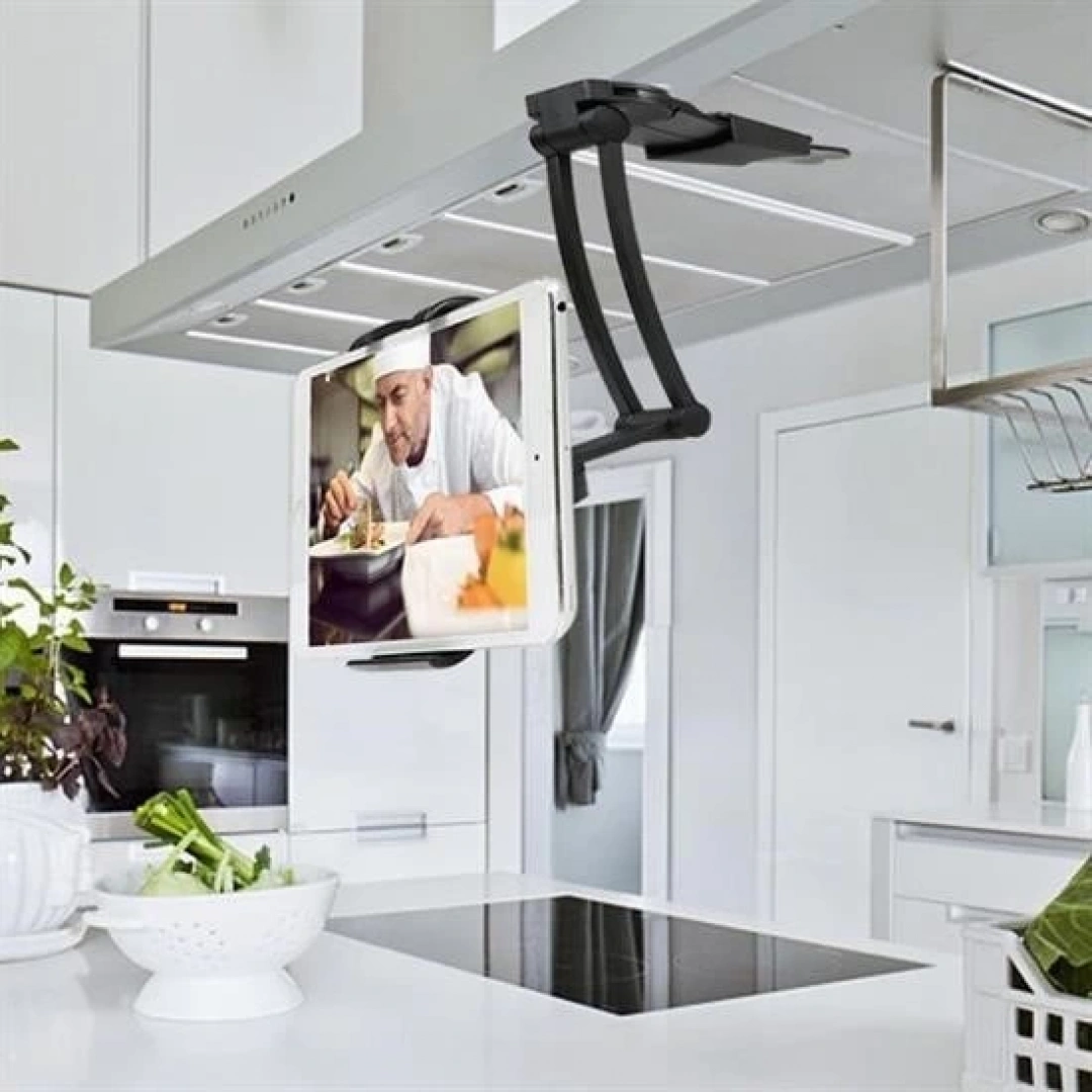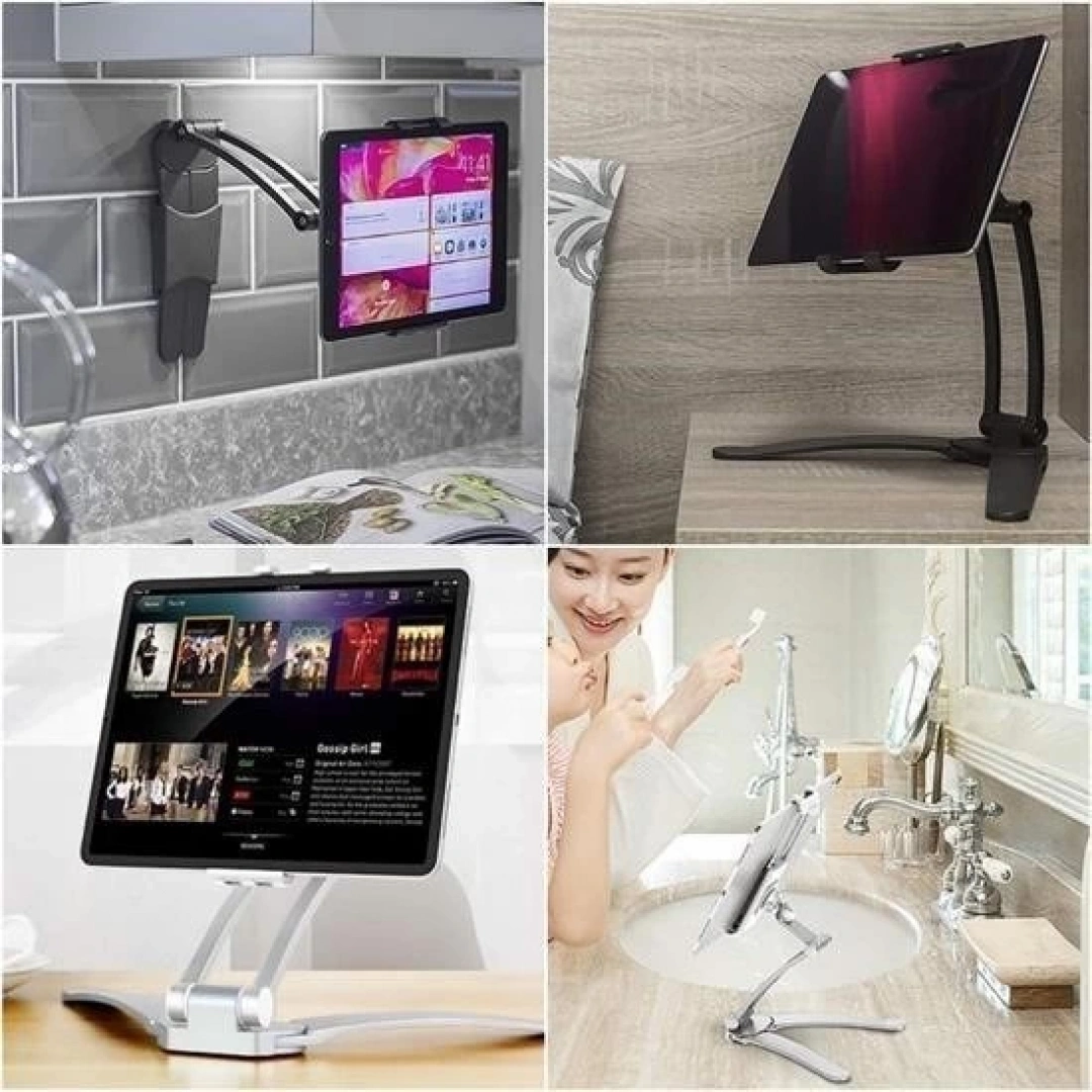 Bu sağlam ve şık alüminyum stand, bir duvara, mutfak dolabının altına yerleştirilebilir veya uygulamalara rahatça erişmek veya videoları izlemek için tezgah üstü stand olarak kullanılabilir