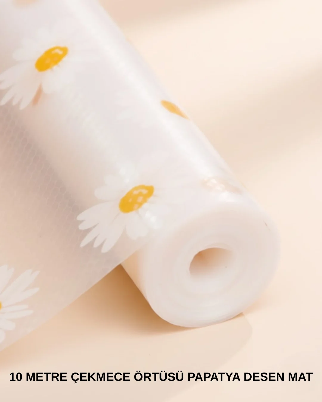 Bu 10 metre papatya desenli kaymaz dolap içi örtü, evinizde düzeni korumak ve yüzeyleri temiz tutmak için tasarlanmıştır. Tek parça halinde sunulan ürün, uzun yapısı sayesinde geniş alanlarda kesintisiz kullanım sağlar. İhtiyaca göre kesilerek farklı çekmecelerde ve raflarda rahatlıkla değerlendirilebilir.Papatya desenleri, çekmece ve dolap içlerine ferah ve düzenli bir görünüm kazandırır. Şeffaf yapısı, içeriğin kolayca görülmesini sağlar ve aradığınız eşyaya hızlıca ulaşmanıza yardımcı olur. Tozdan koruyucu özelliği, eşyaların daha hijyenik kalmasına katkı sağlar.Kaydırmaz yüzeyi sayesinde çekmece içinde sabit durur. Çekmece hareket ettirildiğinde mat kaymaz ve eşyalar dağılmaz. Yapışkan içermeyen yapısı, yüzeylere zarar vermez ve iz bırakmaz.Kolay temizlenebilir olması, günlük kullanım için büyük avantaj sağlar. 10 metrelik uzunluğu, mutfak ve banyo gibi çok çekmeceli alanlarda tek ürünle düzenleme imkânı sunar. Hem dekoratif hem de işlevsel bir üründür.