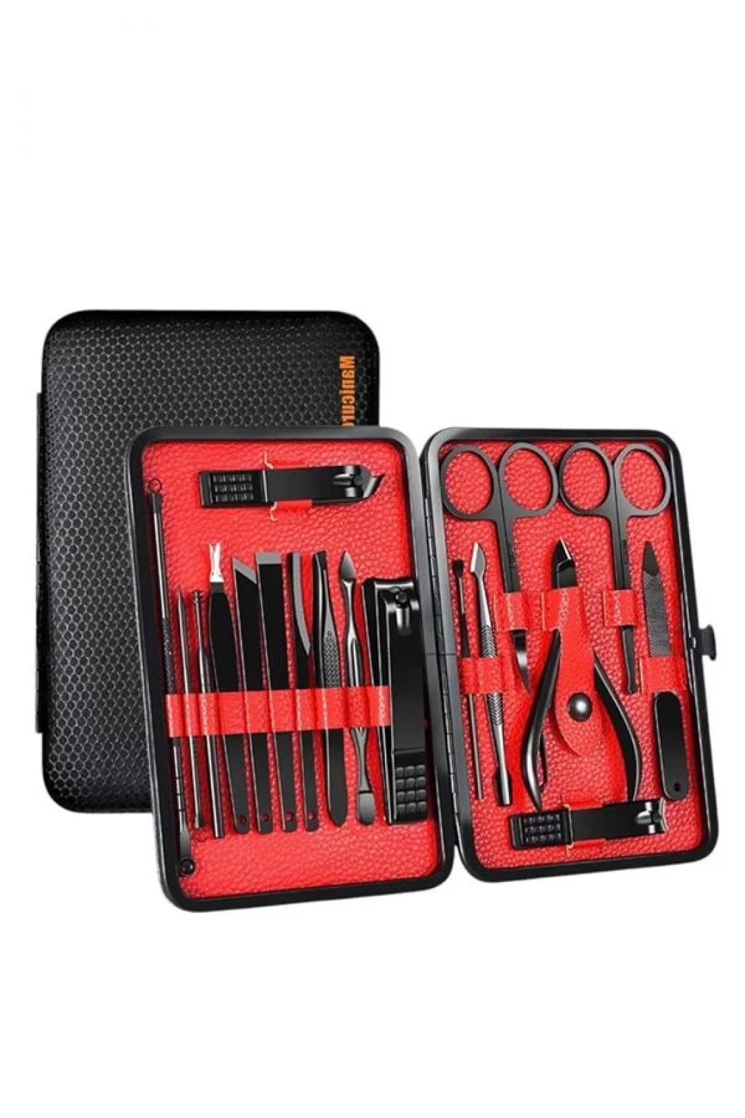 Özel tasarımıyla dikkat çeken bu 17 parçalık manikür seti, el ve ayak bakımınızı profesyonelce yapmanız için tüm gerekli malzemeleri bir araya getiriyor. Paslanmaz çelikten üretilmiş dayanıklı ve uzun ömürlü parçaları sayesinde güvenli sterilizasyon sağlar, kolay temizlenir ve korozyonu önleyerek hijyenik bir kullanım sunar. Yeni nesil siyah kaymaz parlatma teknolojisi ile üretilmiş keskin ve ergonomik tasarımı, kullanım kolaylığı ve estetik görünümü bir araya getirir.Şık ve sağlam deri kaplama kutusu sayesinde düzenli bir şekilde saklanabilir ve tek düğmeyle kolayca açılıp kapanabilir. Hafif ve taşınabilir yapısıyla çantanızda rahatça taşıyabilir, günlük kullanım veya seyahatlerinizde yanınızda bulundurabilirsiniz. Setin içeriğinde büyük, küçük ve sivri uçlu tırnak makasları, çift uçlu komedon, törpü, et ittirici, çift taraflı tırnak kaldırma aleti, makas, pedikür bıçakları, V şeklinde et itme aparatı, tırnak temizleme çubuğu, cımbız, iğneli komedon ve kulak temizleme aparatı bulunmaktadır.Her detayı düşünülerek tasarlanmış bu manikür seti, hem kendi bakımınızı pratik şekilde yapmanızı sağlar hem de sevdiklerinize hediye edebileceğiniz şık ve kullanışlı bir alternatif sunar.