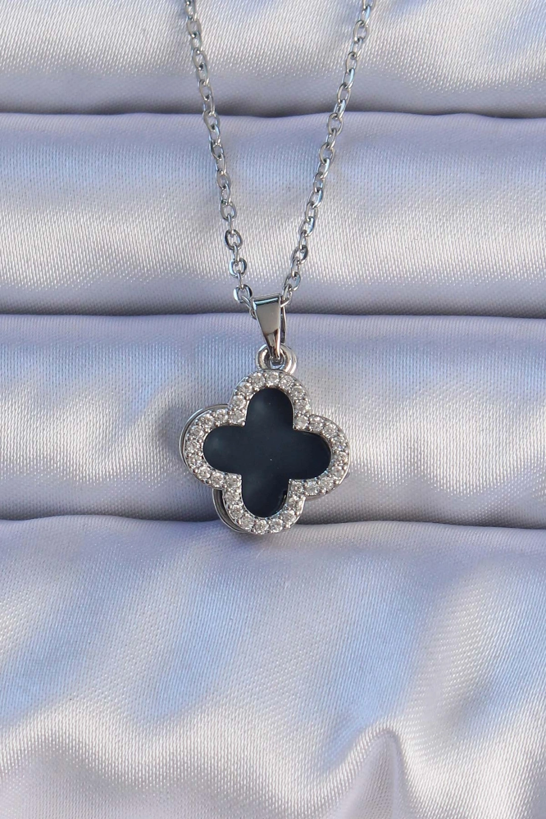 BFS 316L Çelik Gümüş Renk Siyah Mineli Zirkon Taşlı Yonca Figürlü Kolye