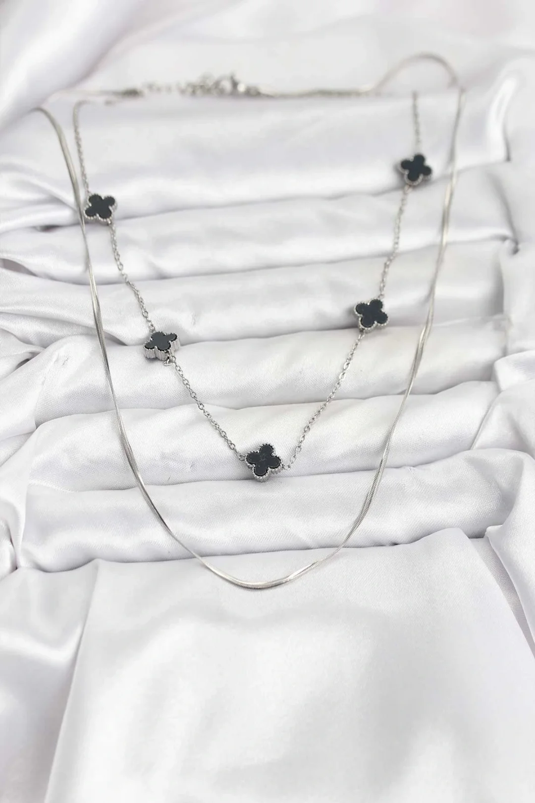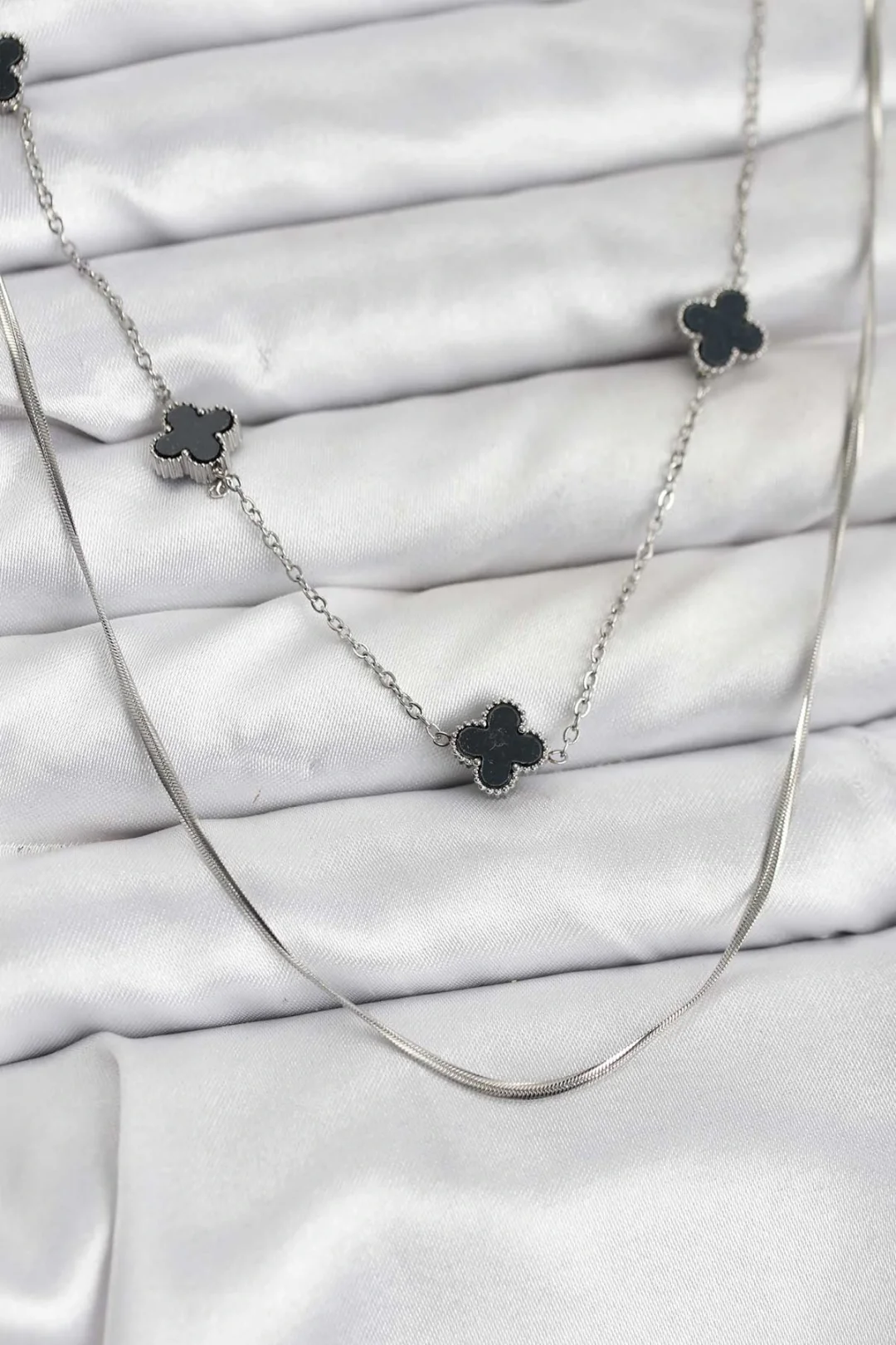 Mey İthalat® 316L Çelik Zincir Gümüş Renk İtalyan Zincirli Siyah Yonca Model Kadın Kolye