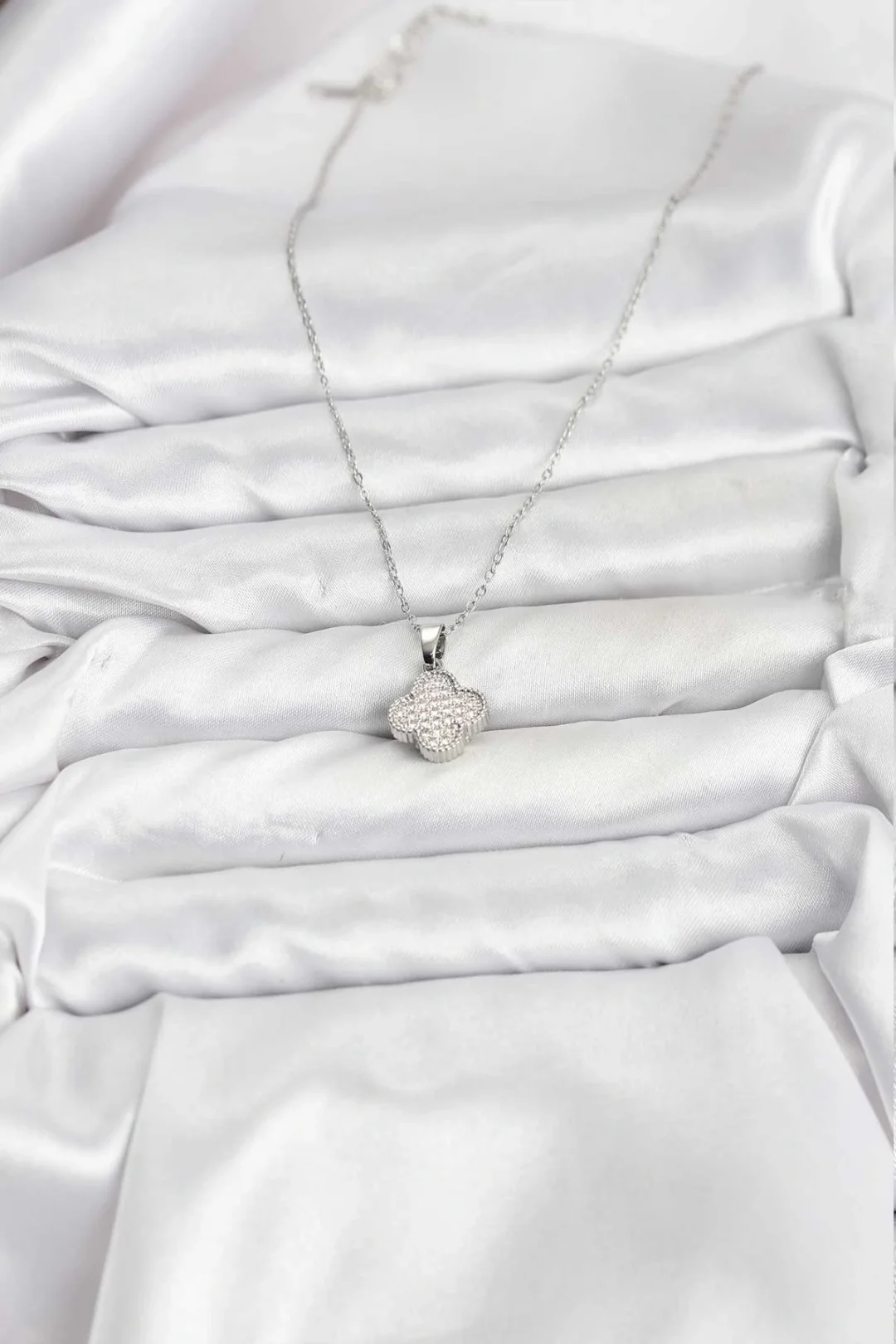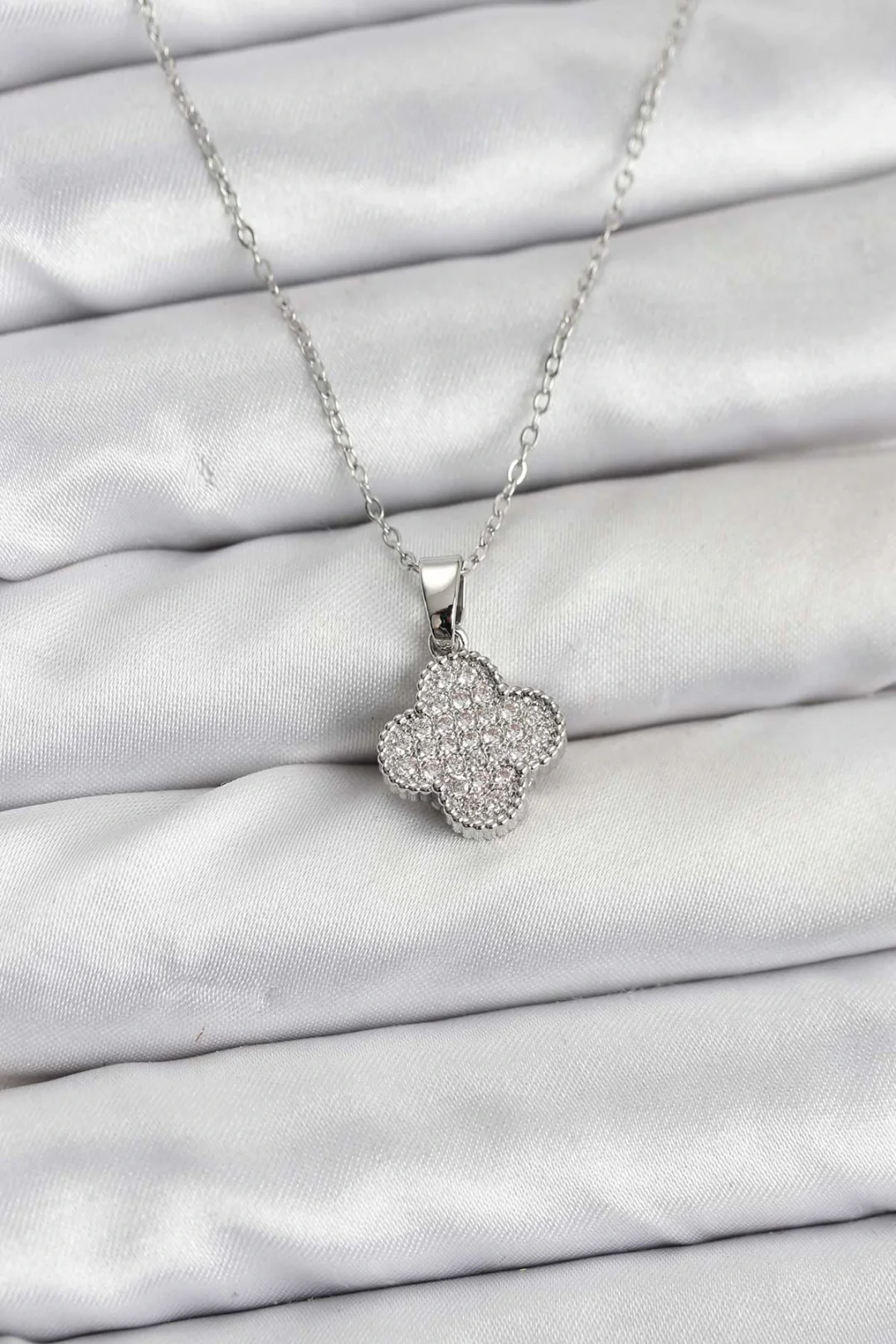 Mey İthalat® 316L Çelik Zincir Gümüş Renk Zirkon Taşlı Yonca Model Kadın Kolye