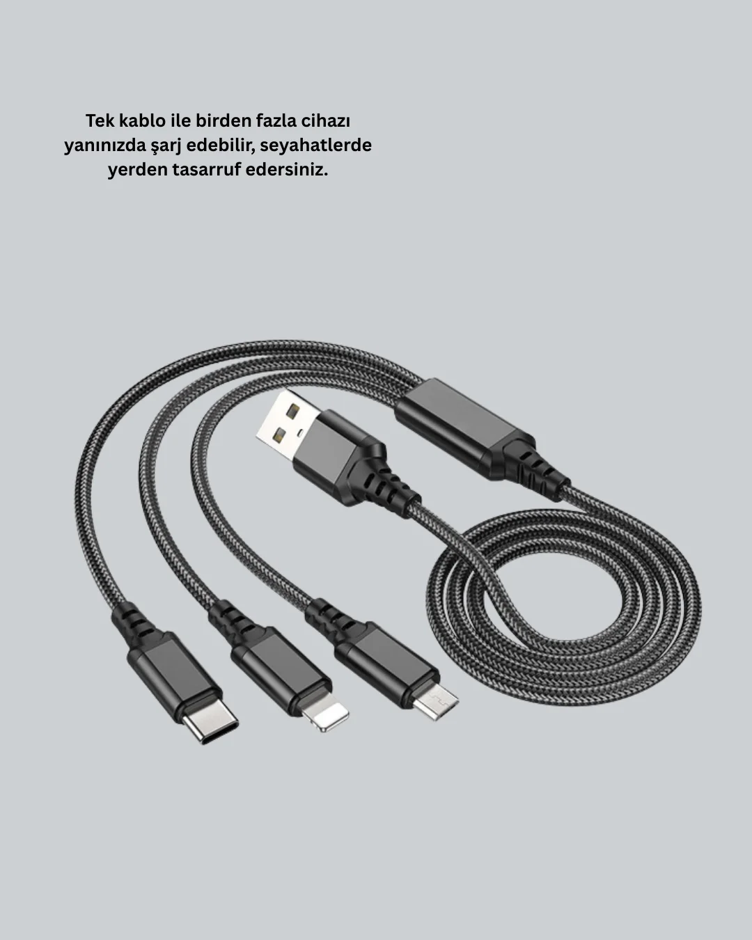 Bu 3’ü 1 arada hızlı şarj kablosu, iOS, Android ve Type-C girişli tüm cihazlarla uyumludur. 1,2 metre uzunluğu ile günlük kullanımda ideal mesafe sunar. Aynı anda birden fazla cihazı şarj edebilme özelliği sayesinde priz kalabalığını ortadan kaldırır. Metal alaşımlı dış kaplama ve TPE malzemesi ile sağlam ve dayanıklıdır. Paslanma, oksitlenme ve kırılmalara karşı korunaklı yapısı uzun ömürlü kullanım sağlar. Dahili akıllı çip teknolojisi, cihaz pilini korur ve güvenli şarj sağlar. Saf bakır tel çekirdeği, düşük direnç ile hızlı şarjı mümkün kılar. Evde, işte veya seyahatte tüm cihazlarınızı tek kablo ile şarj edebilme kolaylığını sunar.