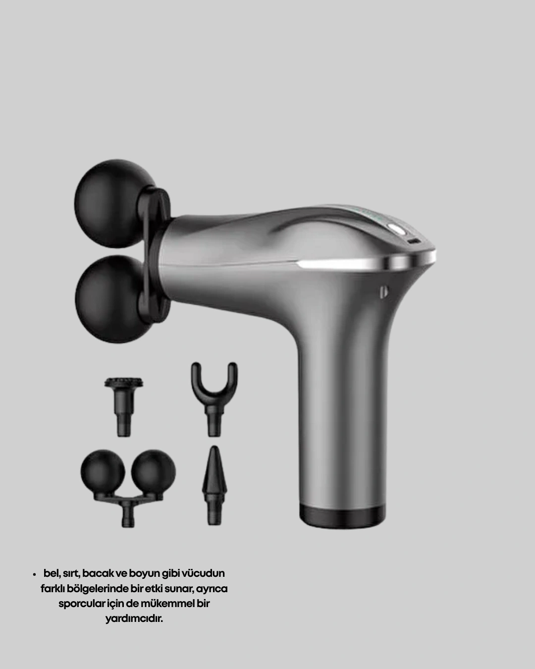 4 başlıklı şarjlı titreşimli masaj aleti, vücudun farklı bölgelerindeki kas gerginliğini azaltmak ve rahatlatıcı bir deneyim sunmak için geliştirilmiş çok fonksiyonlu bir masaj cihazıdır. Güçlü titreşim teknolojisi sayesinde bel, sırt, boyun ve bacaklarda etkili bir masaj performansı sağlar. Günlük yorgunluğu azaltmak veya spor sonrası toparlanmayı hızlandırmak için ideal bir çözümdür.Cihaz, dört farklı masaj başlığı ile birlikte gelir. Bu başlıklar; geniş kas bölgelerine, hassas noktalara ve derin dokulara uygun şekilde tasarlanmıştır. Başlık çeşitliliği sayesinde kullanıcı, kendi ihtiyacına göre en uygun masaj türünü seçerek kişiselleştirilmiş bir deneyim elde eder.Taşınabilir yapısı ve şarjlı sistemi, cihazın her ortamda kullanılmasını mümkün kılar. Evde, ofiste, spor salonunda veya seyahatlerde kolayca taşınabilir. Ergonomik gövdesi elinizde rahat bir kavrama sağlar ve uzun süre kullanımda bile konfor sunar.Güçlü motoru, kas noktalarına derinlemesine etki ederek gevşeme hissi yaratır. Günün stresini azaltmak, kan dolaşımını desteklemek ve kas dokusunun rahatlamasına yardımcı olmak için oldukça etkilidir. Kullanıcı dostu tasarımı sayesinde her yaş grubuna hitap eder.Çok kademeli hız ayarı, masaj yoğunluğunu kontrol etmenize olanak tanır. Bu özellik hem hassas bölgelerde hem de yoğun masaj gerektiren noktalarda ideal bir kullanım sağlar.Uzun süreli kullanım için geliştirilmiş şarj edilebilir batarya, cihazın kesintisiz performans sunmasına yardımcı olur. Hafif yapısı ile pratik bir kullanım sunan bu masaj tabancası, günlük yaşamda hızlı bir şekilde rahatlamaya ihtiyaç duyan herkes için etkili bir çözümdür.Bu masaj aleti, modern tasarımı, taşınabilir yapısı ve güçlü performansı ile kişisel bakım rutinlerini güçlendirmek isteyen kullanıcılar için mükemmel bir tercihtir.