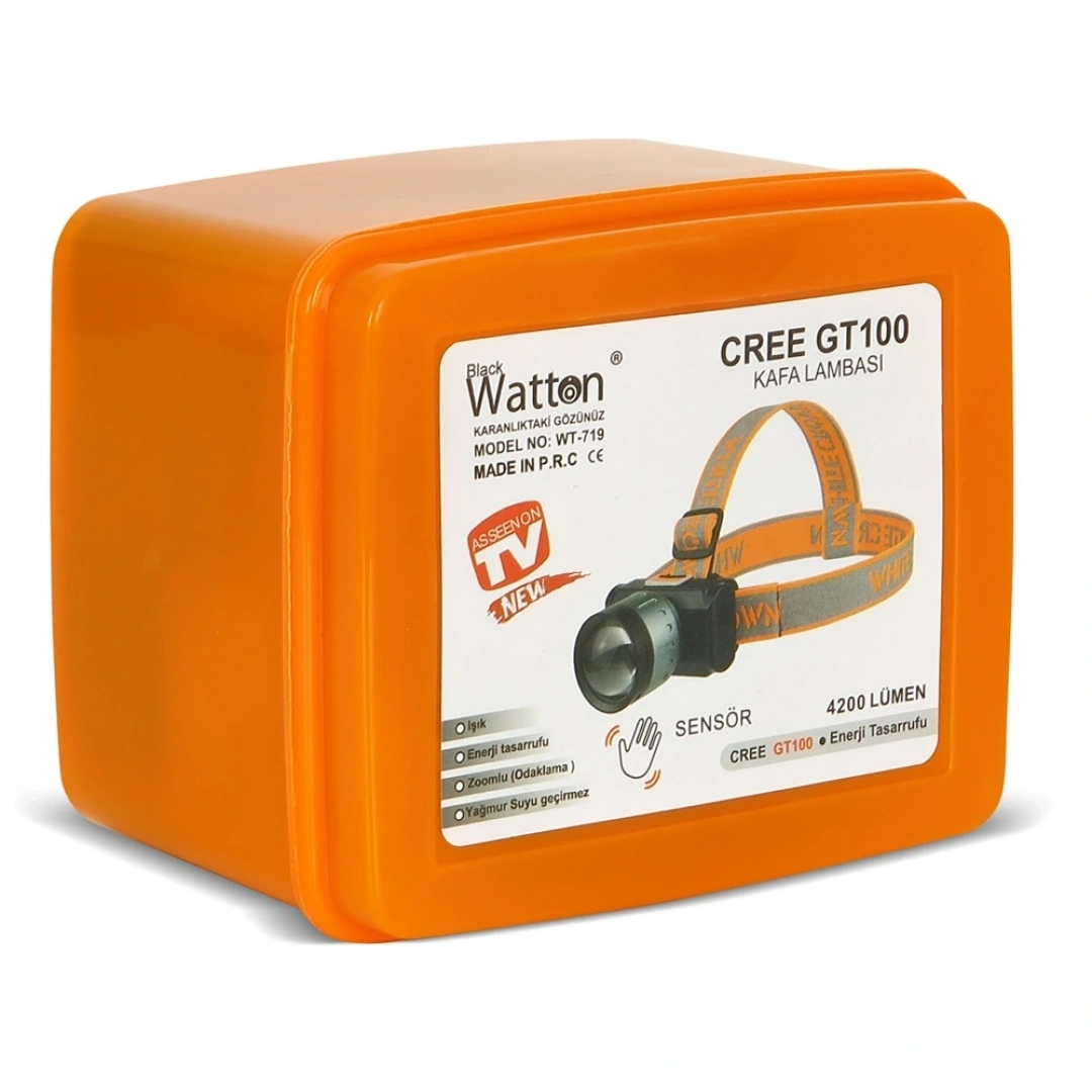 Ürün Kodu                            :Wt-719Boyutlar                                :8cm-7cmIşık Özelliği                           :CREE GT100 LEDIşık Mesafesi                         :250 mt 450 mtIşık Rengi                              :BeyazÇalışma Süresi                     :6-8 ( Aralıklarla )Gövde Malzemesi                :Sert Plastik- Alüminyum metalKullanım Şekli                      :Nokta ve Geniş AydınlatmaKullanım Özellikleri             :Esnek Lastiği ile Kolay Sabitlenebilme, Oynar Başlık + Teknik Özellikleri                 :Şarj Edilebilir Lityum iyon BataryaKutu İçeriği                           :Ürün , Esnek Lastik , Şarj KablosuAmpül Ömrü                         :100.000 SaattirKullanım Yeri                        :Av, Kamp,Ev, Okul, Araba, Otel, RestorantTasarruflu Enerji Harcama ÖzelliğiÖnemli Uyarılar                    :Direk Göz İle Temas Ettirmeyiniz