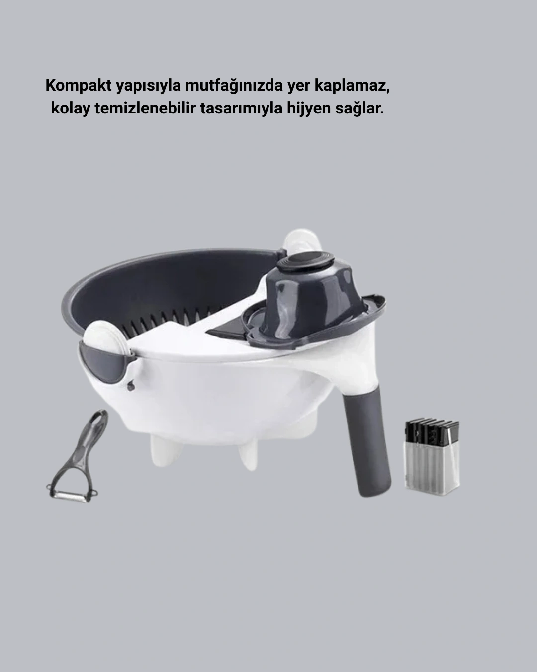 Mutfakta hız, düzen ve güvenlik isteyen kullanıcılar için tasarlanan 5 Fonksiyonlu Döner Süzgeçli Rende, çok yönlülüğü sayesinde yemek hazırlama sürecini daha pratik ve keyifli hale getirir. Ürün, döner mekanizmalı akıllı yapısı ile farklı rende ve doğrama fonksiyonlarını tek cihazda toplar. Böylece sebze ve meyveleri ince rendeleme, kalın rendeleme, şerit kesme, yuvarlak dilimleme veya klasik doğrama şeklinde birkaç saniye içinde hazırlayabilirsiniz.Cihazın döner mekanizması, bıçakların tek bir hareketle kolayca değiştirilmesini sağlar. Bu fonksiyon, özellikle çok çeşit sebzeyle çalışırken büyük zaman tasarrufu sunar. Havucunuzu şerit, salatalığınızı dilim, patatesinizi ince rende yapmak için ayrı ayrı ürün kullanmaya gerek kalmaz.Hazne kısmı, rendeleme ve doğrama sırasında parçalanan yiyecekleri toplar; böylece tezgâhta dağınıklık oluşmaz. Aynı hazne aynı zamanda süzgeç işlevi gördüğünden, doğradığınız sebzeleri hemen yıkayıp süzebilir, ekstra kap kullanmadan işlemi tamamlayabilirsiniz. Bu özellik, mutfakta hem temizlik hem düzen açısından büyük avantaj sağlar.Kaymaz tabanı, kullanım sırasında ürünün sabit durmasını sağlar ve olası kaymaları engeller. Bu güvenlik detayı, kesme işlemlerini daha kontrollü ve rahat hale getirir. Buna ek olarak el koruma aparatı, özellikle küçük sebzelerin doğranmasında ellerinizi bıçaklardan uzak tutarak güvenli kullanım sunar.Ergonomik gövdesi sayesinde elinizle rahat kavrayabilir, uzun süreli kullanımlarda bile yorulma yaşamazsınız. Kompakt formu mutfak dolaplarında fazla yer kaplamaz, hafif yapısı ile kolay taşınır. Bıçakları paslanmaz çelikten üretilmiştir ve uzun ömürlü kullanım sağlar. Cihazın tüm plastik aksamı gıda ile temasa uygun ve hijyeniktir.Kolay sökülebilir parçaları sayesinde temizlik süreci son derece pratiktir. Su altında hızlıca yıkanabilir, hijyenik şekilde saklanabilir.Evde yemek hazırlamayı sevenlerden profesyonel mutfaklarda çalışanlara kadar herkes için ideal olan bu döner süzgeçli rende, mutfağınızın vazgeçilmez yardımcılarından biri olacak.