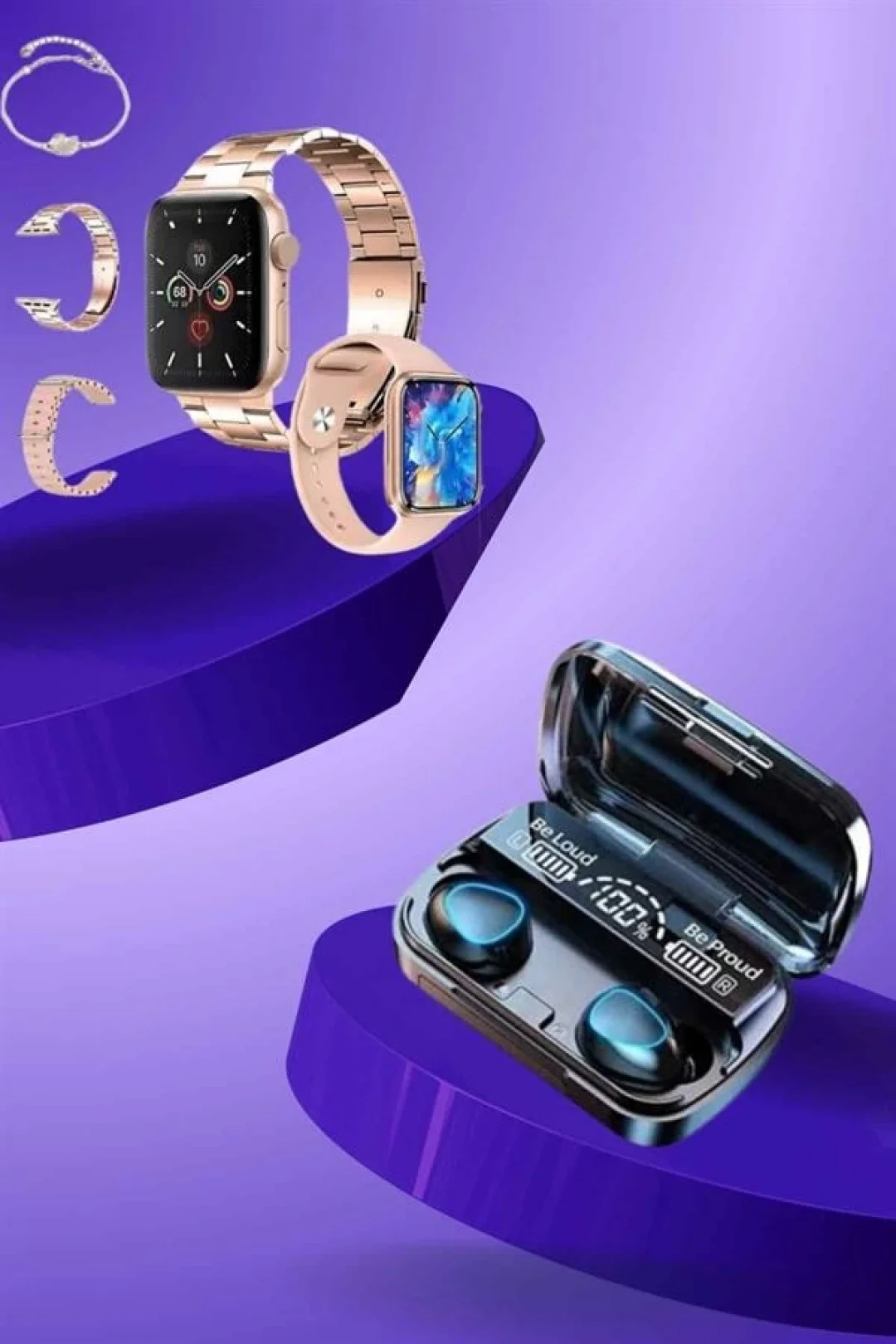 AKILLI SAATYeni Nesil Mini Kadın Akıllı Saat, şıklığı ve fonksiyonelliği bir araya getiren tasarımıyla kadınlar için ideal bir seçenek sunuyor. Almanya üretimi ultra dayanıklı model, özel wireless şarj özellikleriyle öne çıkıyor ve Türkçe menüsü sayesinde kullanıcı dostudur. Kutu içeriğinde, mini akıllı saat, 3 farklı kordon, hediye bileklik, wireless şarj kablosu ve kullanım kılavuzu bulunmaktadır. Şık pembe kutusu, hediye olarak tercih edilmesini sağlayan bir özellik taşır. 41 mm kavisli oval kenarlı yeni tasarımı ve 1,70 inç AMOLED ekranı ile yüksek çözünürlükte HD görüntü sağlar.Saat, nabız ölçer, uyku izleyici, kan basıncı, tansiyon, EKG ve vücut sıcaklığı ölçer gibi sağlık izleme özellikleriyle sağlığınızı takip etmenizi sağlar. 117 farklı spor modu ve adım, kalori, kalp ritmi ölçme gibi özellikler ile aktivite takibini oldukça detaylı yapabilirsiniz. Ayrıca akıllı hatırlatıcılar sayesinde su içme ve hareketsizlik gibi hatırlatmalar alabilir, tüm bildirimleri ve mesajları anında saatinizde görebilirsiniz.Bluetooth bağlantısı ile yüksek kaliteli müzik dinleyebilir ve uzaktan fotoğraf çekme özelliği ile fotoğraflarınızı kolayca çekebilirsiniz. Suya dayanıklı yapısı, günlük kullanımda sıklıkla tercih edilmesini sağlar; ancak deniz ve havuz gibi basınçlı suya karşı su geçirmez.Saatin sunduğu diğer özellikler arasında Türkçe ve çoklu dil desteği, saatimi bul, telefonumu bul, alarm, kronometre, hava durumu, hesap makinesi gibi fonksiyonlar bulunur. Kordonu değiştirilebilir, bu sayede kişisel tercihlere göre tasarımı özelleştirilebilir. 24 ay garanti süresi ile kullanıcılarına güvenli bir deneyim sunar.KULAKLIKYeni M10 Bluetooth Kulaklık, güçlü ses performansı ve çift mikrofon teknolojisi ile müzik dinlerken ve telefon görüşmeleri yaparken üstün bir deneyim sunar. Ses aktarımı sırasında gecikme yaşanmaz, bu da net ve kesintisiz iletişim sağlar. Süper 3D ses kalitesi, müzik dinlerken ses gecikmesini ortadan kaldırarak etkileyici bir performans sergiler. Spor ve egzersiz sırasında rahatça yerinde kalan tasarımı ile konforlu kullanım sunar.Yüksek kaliteli malzemelerle üretilen M10 kulaklık, dayanıklılığı ve ses kalitesiyle öne çıkar. Terlemeye dayanıklı ve su geçirmez özellikleri sayesinde uzun süreli kullanıma uygundur. Geliştirilmiş lithium polymer bataryası, kulaklıkla birlikte 16 saat kesintisiz müzik dinleme süresi sağlar.Tuşlu (manuel) kontrol sistemi, gelen aramaları kolayca cevaplamanızı ve sonlandırmanızı sağlar. Ayrıca, telefonunuzu elinize almadan ses seviyesini ayarlayabilir, müzik çalma listenizi ileri ve geri sarabilirsiniz. Tüm Android ve iOS cihazlarla uyumlu olan M10 Bluetooth kulaklık, evrensel bir modeldir.Kullanım oldukça basittir: Kulaklıkları powerbank adaptöründen çıkarın, telefonunuzun Bluetooth özelliğini açarak otomatik olarak bağlanın ve müziğinizin tadını çıkarın.