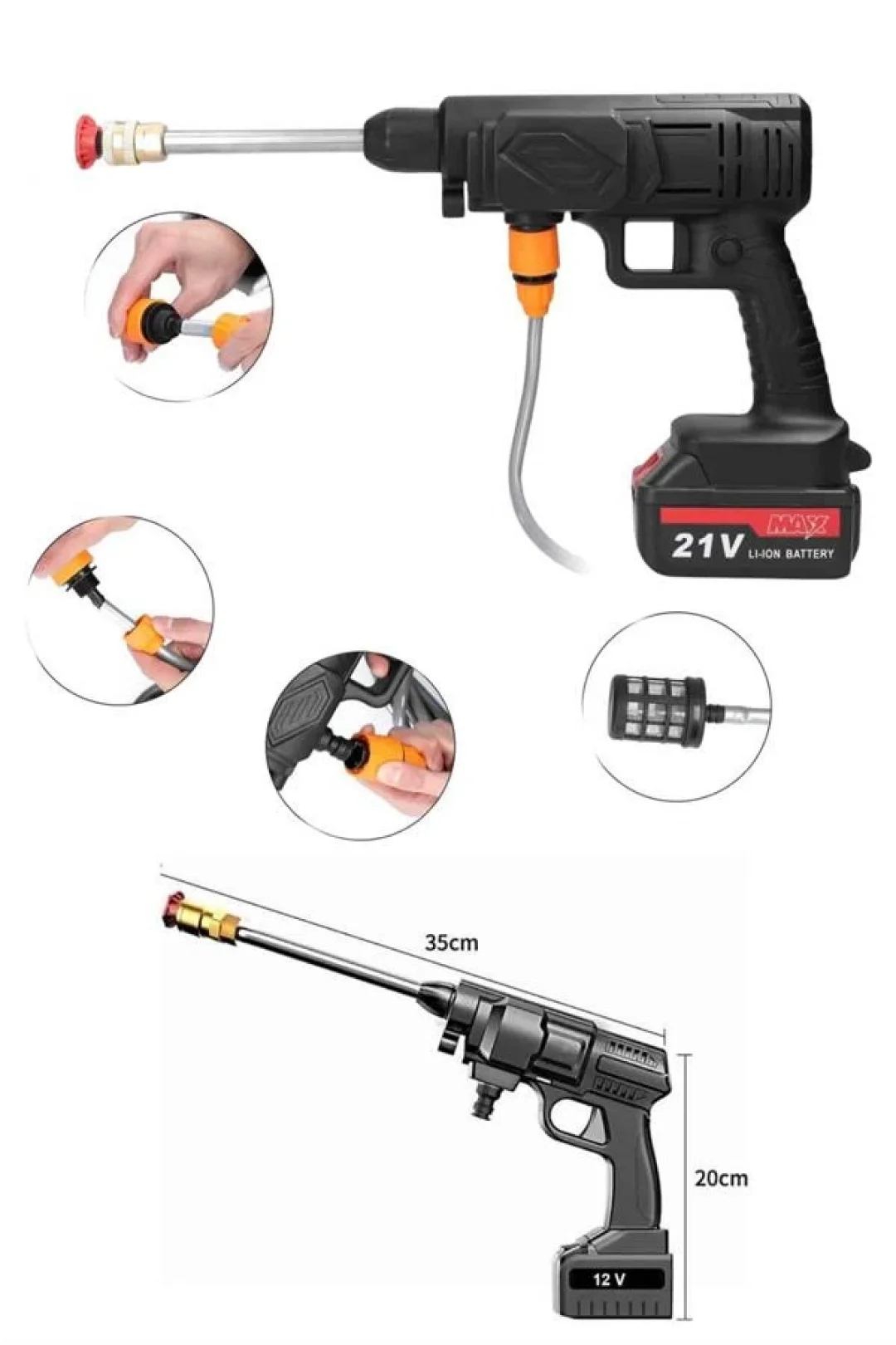Taşınabilir Akülü Yıkama Makinesi - Güçlü Temizlik, Kolay KullanımGüçlü performansı ve taşınabilirliğiyle dikkat çeken Akülü Yıkama Makinesi, evde ve dış mekanlarda temizlik ihtiyaçlarınızı hızlı ve verimli bir şekilde karşılamak için ideal bir çözümdür. 21V XR Li-Ion bataryası, kömürsüz motoru ve uzun süreli çalışma kapasitesi ile mükemmel temizlik sonuçları sunar. Bu cihaz, araba yıkamadan bahçe temizliğine kadar çeşitli temizlik işlemlerini kolayca gerçekleştirmenizi sağlar.Etkili Temizlik ve Güçlü Performans1500mAh çift aküsü ve 5 pilli dahili bataryası ile uzun süreli kullanım sağlar. 1.7 Mpa'lık yüksek tepe basıncı, en inatçı kirleri bile rahatlıkla temizlemenize olanak tanır. 3.2 L/dak su çıkışı sayesinde, her kullanımda etkili ve hızlı temizlik sağlarsınız. Metal pompa silindiri, uzun ömürlü ve dayanıklı bir kullanım için tasarlanmıştır, böylece cihaz uzun süre performans kaybı yaşamaz.Hızlı Şarj ve Kolay Kullanım60 dakikalık hızlı şarj süresi ile her zaman kullanıma hazırdır. 2 kg'lık hafif tasarımı, taşımasını ve yönlendirilmesini son derece kolaylaştırır. Ergonomik yapısı sayesinde her yaştan kullanıcı tarafından rahatlıkla kullanılabilir. Araba yıkama, bisiklet temizliği veya evde bahçe sulama gibi farklı kullanım alanlarında da size büyük kolaylık sağlar.Dayanıklı ve Uzun Süreli KullanımÜrün, 2 yıl garanti süresiyle birlikte gelir, böylece uzun vadeli kullanımda güvenli bir deneyim sunar. Hafif yapısı, güçlü performansı ve yüksek dayanıklılığı ile her türlü temizlik işinizi zahmetsizce tamamlamanızı sağlar. Hem evde hem de dış mekanlarda kullanım için mükemmel bir tercihtir.