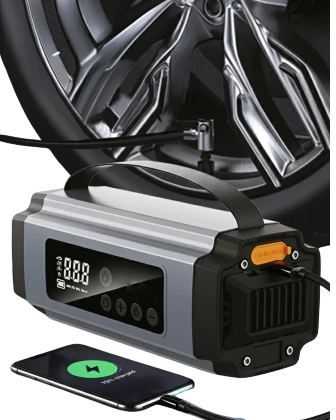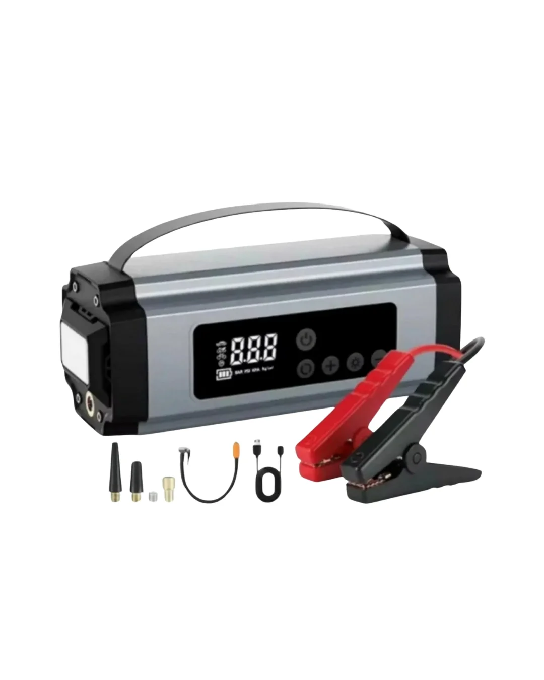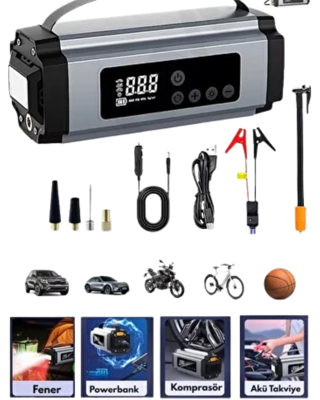 Yolda kalma riskini minimuma indirmek isteyen herkes için tasarlanmış bu çok fonksiyonlu cihaz, araç içinde bulunması gereken temel ekipmanlardan biridir. Akü takviyesi, lastik şişirme, mobil şarj ve aydınlatma özelliklerini tek bir üründe sunarak hem zamandan hem de yerden tasarruf sağlar.Akü takviye fonksiyonu sayesinde yardım beklemeden aracınızı çalıştırabilirsiniz. Dijital ekranlı hava kompresörü ile lastiklerinizi doğru basınca getirerek güvenli sürüşün keyfini çıkarabilirsiniz. Dahili batarya, elektronik cihazlarınız için güvenilir bir enerji kaynağı sunar.LED ışık özelliği, gece ve acil durumlarda ekstra güvenlik sağlar. Kompakt tasarımı sayesinde kolay taşınır ve her an kullanıma hazırdır. Çok yönlü kullanım alanı ile sadece araçlar için değil, günlük yaşamda da fayda sağlar.Hazırlıklı olmak isteyen sürücüler için bu cihaz, tek bir ürünle birçok ihtiyacı karşılayan akıllı bir çözümdür.