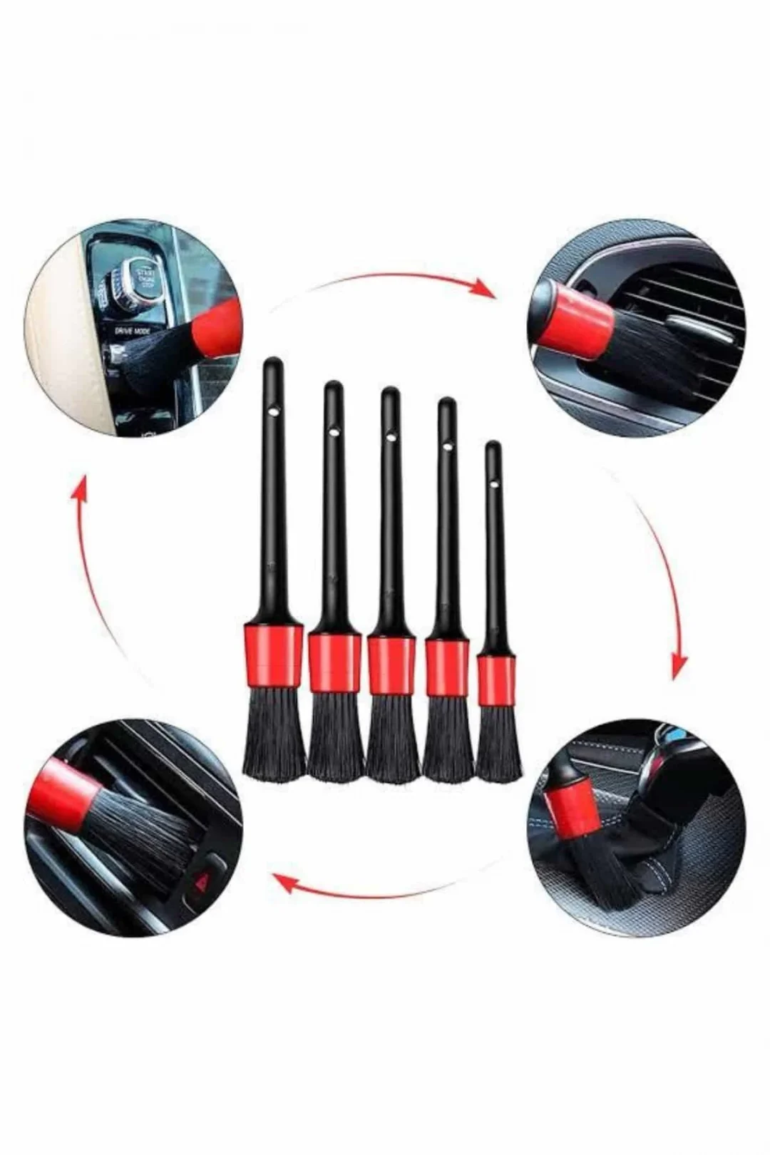 Araç iç ve dış temizlik işlemlerini zahmetsiz hale getiren bu 5’li detay fırça seti, her aracın ihtiyaç duyduğu detaylı bakım için idealdir. Yumuşak, çizmeyen sentetik kılları sayesinde hassas yüzeylerde bile gönül rahatlığıyla kullanılabilir. Jant temizliğinden motor aksamına, iç konsol detaylarından havalandırma menfezlerine kadar ulaşılması zor alanlarda üstün temizlik performansı sunar. Farklı boyutlardaki fırçalar, kullanım kolaylığı sağlarken saplarında bulunan askı delikleriyle pratik bir şekilde saklanabilir. Islak ya da kuru temizlik için uygun olan bu fırçalar, evde ya da garajda araç bakım rutinlerinizde büyük kolaylık sağlar. Hafif yapısı, konforlu tutuş sunan ergonomik plastik sapları ve şık siyah-kırmızı tasarımıyla hem işlevsel hem de estetik bir ürün grubudur. Geniş kullanım alanı sayesinde otomobil, motosiklet, bisiklet, karavan ve tekne gibi araçlarda güvenle tercih edilebilir. Bu set, araçlarını sevenler ve detay temizliğe önem veren kullanıcılar için vazgeçilmez bir yardımcı olacak.