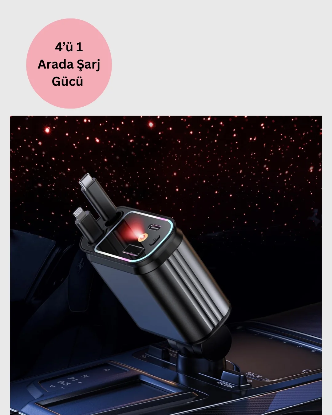 Aracınızda düzeni korumak ve aynı anda birden fazla cihazınızı güvenle şarj etmek artık çok kolay! 66W gücünde 4 portlu bu araç şarj cihazı, günlük yolculuklardan uzun seyahatlere kadar her ihtiyacınızı karşılamak için tasarlandı. Kompakt ve çekilebilir kablo yapısı sayesinde kablo karmaşasını ortadan kaldırır, aracınızı daha düzenli ve şık hale getirir. 80 cm’ye kadar uzayabilen kablosu, sürüş esnasında esneklik sunarken aynı zamanda kullanım kolaylığı sağlar.Gelişmiş PD ve QC hızlı şarj teknolojisi ile donatılmış olan bu cihaz, telefon, tablet, kulaklık, akıllı saat ve diğer tüm elektronik cihazlarınızı güvenle şarj eder. 180 derece ayarlanabilir başlığı sayesinde aracınızın her konumunda rahatlıkla kullanılabilir ve sallantılarda gevşeme yapmadan sabit kalır. Ayrıca, LED atmosfer ışıkları ile gece sürüşlerinize keyifli bir ambiyans katar. Müzik ritmine uyum sağlayan ışık modları, araç içi deneyiminizi benzersiz hale getirir.12V-24V uyumluluğu sayesinde otomobil, SUV, minibüs ve kamyonlarda kullanılabilen bu araç şarj cihazı, aynı anda 4 cihazınızı yüksek hızda ve güvenle şarj etmenizi sağlar. Hem şık tasarımı hem de güçlü teknolojisi ile vazgeçilmez bir yol arkadaşıdır.