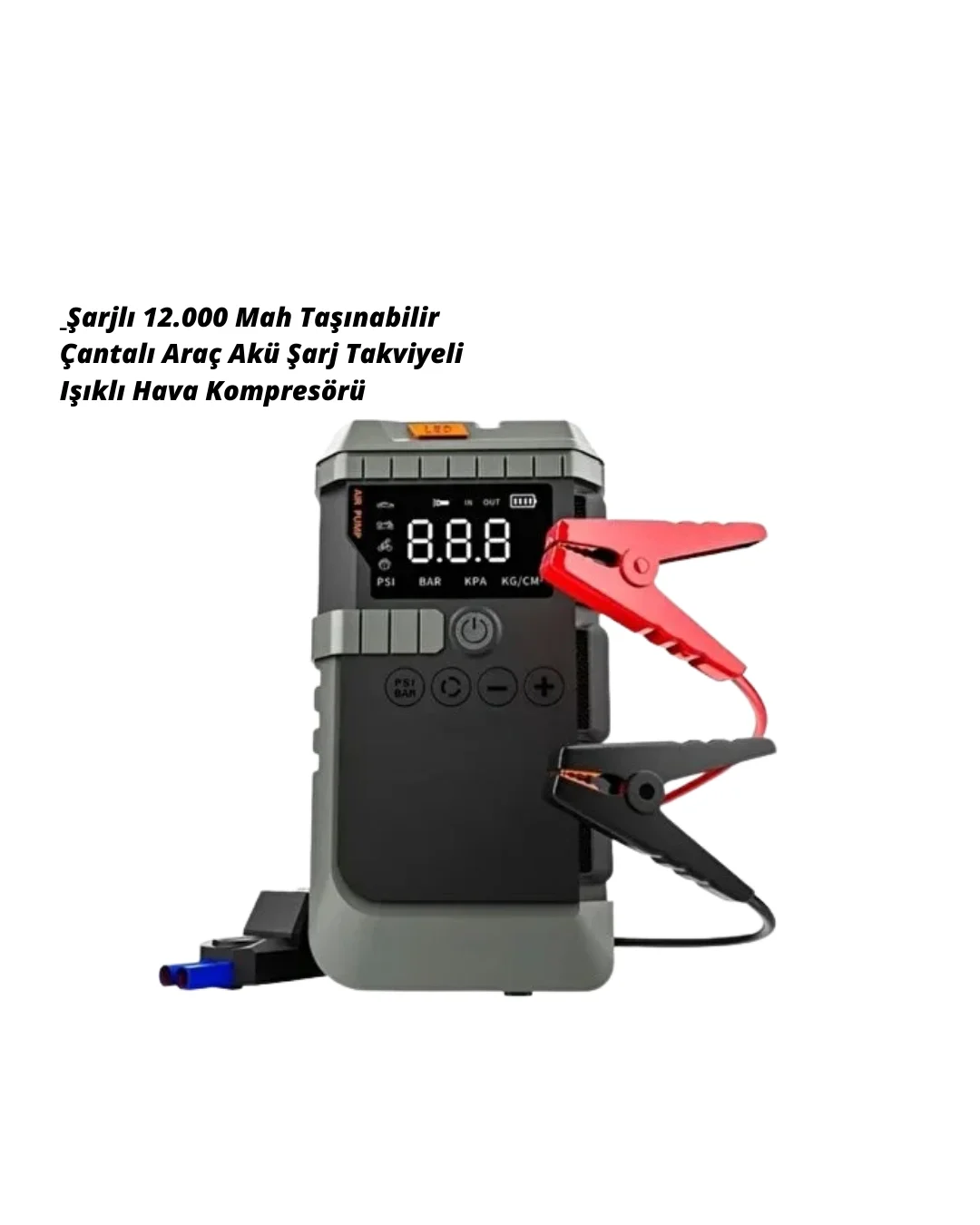 Araç kullanıcılarının güvenliğini ve konforunu ön planda tutan bu 4’ü 1 arada taşınabilir cihaz, acil durumlara karşı hazırlıklı olmayı kolaylaştırır. Akü takviye fonksiyonu sayesinde araç çalıştırma sorunlarına hızlı çözüm sunarken, hava kompresörü ile lastik basıncı her an kontrol altında tutulabilir. Bu özellikler, özellikle uzun yolculuklarda ve şehir dışı sürüşlerde sürücünün içinin rahat olmasını sağlar. Yüksek kapasiteli bataryası, powerbank fonksiyonu ile birleşerek mobil cihazların şarj edilmesini mümkün kılar ve yolculuk sırasında bağlantıda kalmayı destekler.Dijital ekranlı kontrol sistemi, tüm fonksiyonların kolayca yönetilmesine olanak tanır. Kullanıcı dostu tasarımı sayesinde teknik bilgi gerektirmeden rahatlıkla kullanılabilir. LED aydınlatma özelliği, gece lastik değişimi, yol kenarı müdahaleleri ve kamp gibi durumlarda büyük avantaj sağlar. Farklı ışık modları, hem aydınlatma hem de uyarı amaçlı kullanım imkânı sunar.Kompakt boyutları ve taşıma çantası, cihazın araç bagajında düzenli ve güvenli şekilde saklanmasını sağlar. Dayanıklı malzeme yapısı, uzun ömürlü kullanım sunarken darbelere karşı ekstra koruma sağlar. Günlük kullanım, uzun yolculuklar ve acil durumlar için tasarlanan bu ürün, tek cihazla birçok ihtiyacı karşılayarak hem ekonomik hem de pratik bir çözüm sunar. Araçta mutlaka bulunması gereken yardımcı ekipmanlardan biri olarak öne çıkar ve sürücülere her koşulda güven verir.