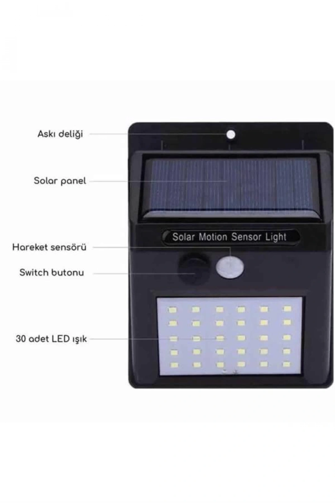 Güneş Enerjisiyle Aydınlanan Akıllı Çözüm: 180 LED’li Hareket Sensörlü Dış Mekan IşığıModern tasarımı ve yüksek verimliliğiyle öne çıkan bu 180 LED’li güneş enerjili sokak lambası, dış mekanlar için pratik ve çevre dostu bir aydınlatma sunar. Güneş enerjisi ile çalışan yapısı sayesinde elektrik masraflarını azaltırken, kullanıcıya konforlu ve sürdürülebilir bir çözüm sağlar. PIR hareket sensörü, yalnızca ihtiyaç anında devreye girerek enerji kullanımını optimize eder.Her Ortama Uyum Sağlayan Dayanıklı YapıYağmur geçirmez özelliğiyle, zorlu hava koşullarında bile kesintisiz aydınlatma sağlar. Bahçeniz, yazlığınız, koridorlar, villalar, sokaklar ya da karayolları gibi açık alanlar için son derece uygundur. Kaliteli plastik gövdesi ve dayanıklı LED bileşenleri ile uzun ömürlü bir kullanım deneyimi sunar.Kullanıcı Dostu Özellikler ve Esnek Mod SeçenekleriAçma-kapama ve mod geçişi için yalnızca tek bir düğme kullanılır, bu da kullanım kolaylığı sağlar. Üç farklı çalışma modu sayesinde ışığın davranışını dilediğiniz gibi ayarlayabilirsiniz:Mod 1: Sadece hareket algılandığında güçlü ışık yanar, ardından tamamen kapanırMod 2: Hareket algılandığında parlak ışık yanar, ardından düşük ışık seviyesine geçerMod 3: Tüm gece boyunca düşük seviyede ışık sağlarBeyaz renkli aydınlatmasıyla karanlık alanları net biçimde aydınlatır ve dış mekan güvenliğini artırır. Elektrik bağlantısı gerektirmeyen bu ürün, yalnızca güneşten aldığı enerjiyle çalışır ve montajı da oldukça basittir.Güneş enerjili bu modern sokak lambası, hem enerji tasarrufu yapmak isteyenler hem de dış mekanlarını güvenli ve estetik bir şekilde aydınlatmak isteyenler için ideal bir tercihtir.