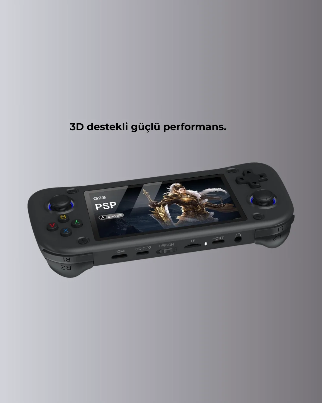 Bu taşınabilir oyun konsolu, oyun dünyasını cebinize getiriyor. 64GB hafıza kartı ve 10000 yüklü oyunla sınırsız eğlence sunar.RK3128 Cortex-A7 işlemci ve 4GB RAM ile güçlü donanım, hızlı tepki ve akıcı performans sağlar. Farklı emülatörleri desteklediği için pek çok oyun formatını açabilirsiniz.4.3 inç IPS ekran ve 640x480 çözünürlük, oyunları net ve canlı görüntülerle oynamanıza olanak tanır.Avuç içi boyutundaki taşınabilir tasarım, cihazı her yere kolayca götürmenizi sağlar. Seyahatlerde veya günlük kullanımda pratik bir çözüm sunar.Şık kutusu sayesinde sevdiklerinize verebileceğiniz hediyelik bir seçenek olarak da uygundur.