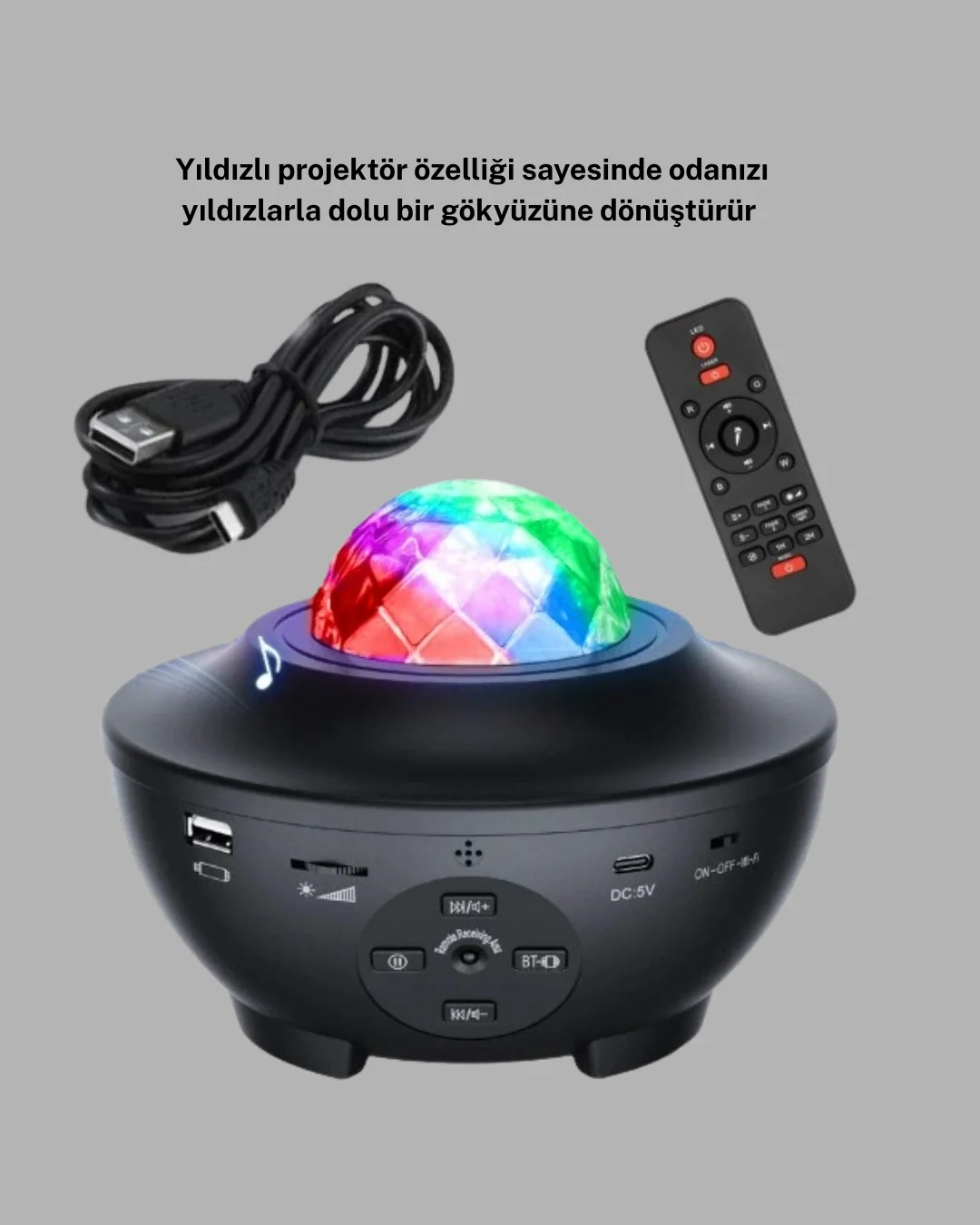 Bu yıldızlı projektör, odanızı eşsiz bir uzay atmosferine dönüştüren etkileyici ışık efektleriyle öne çıkan çok yönlü bir aydınlatma ürünüdür. Galaxy modu, dönen renk bulutları ve yıldız desenleriyle odanıza derinlik katar. Hem sakinleştirici hem de göz alıcı bir görünüm sunan bu aydınlatma, günün yorgunluğunu atmak isteyenler için ideal bir ortam hazırlar.Ayarlanabilir parlaklık seviyesi sayesinde ışık yoğunluğunu ortamın ihtiyacına göre şekillendirebilirsiniz. Çocukların uyumasına yardımcı olacak loş bir moddan partileri renklendirecek güçlü bir ışığa kadar geniş bir kullanım yelpazesi sunar. Farklı renk seçenekleri ve efekt kombinasyonları sayesinde odanın havasını tek bir dokunuşla değiştirebilirsiniz.Projektörün kullanımı oldukça kolaydır. Üzerindeki butonlar ile renk geçişlerini, efekt modlarını ve parlaklığı anında değiştirebilirsiniz. Hafif ve taşınabilir yapısı, ürünü farklı alanlarda rahatça kullanmanıza imkan tanır. Yatak odasında romantik bir ortam oluşturabilir, çocuk odasında rahatlatıcı bir uyku ışığı olarak kullanabilir veya eğlence mekanlarında göz alıcı bir atmosfer yaratabilirsiniz.LED teknolojisi enerji tasarrufu sağlar ve düşük ısı yaydığı için güvenli kullanım sunar. Bu özellik, özellikle çocuk odasında kullanıldığında büyük avantaj sağlar. Çalışma esnasında sessiz olması ise meditasyon, yoga, kitap okuma veya uyku öncesi rahatlama için ideal bir ortam oluşturur.Modern tasarım çizgileri ile ev dekorasyonuna uyum sağlayan yıldızlı projektör, hem işlevselliği hem de görsel etkisi ile yaşam alanlarına değer katan dekoratif bir üründür.