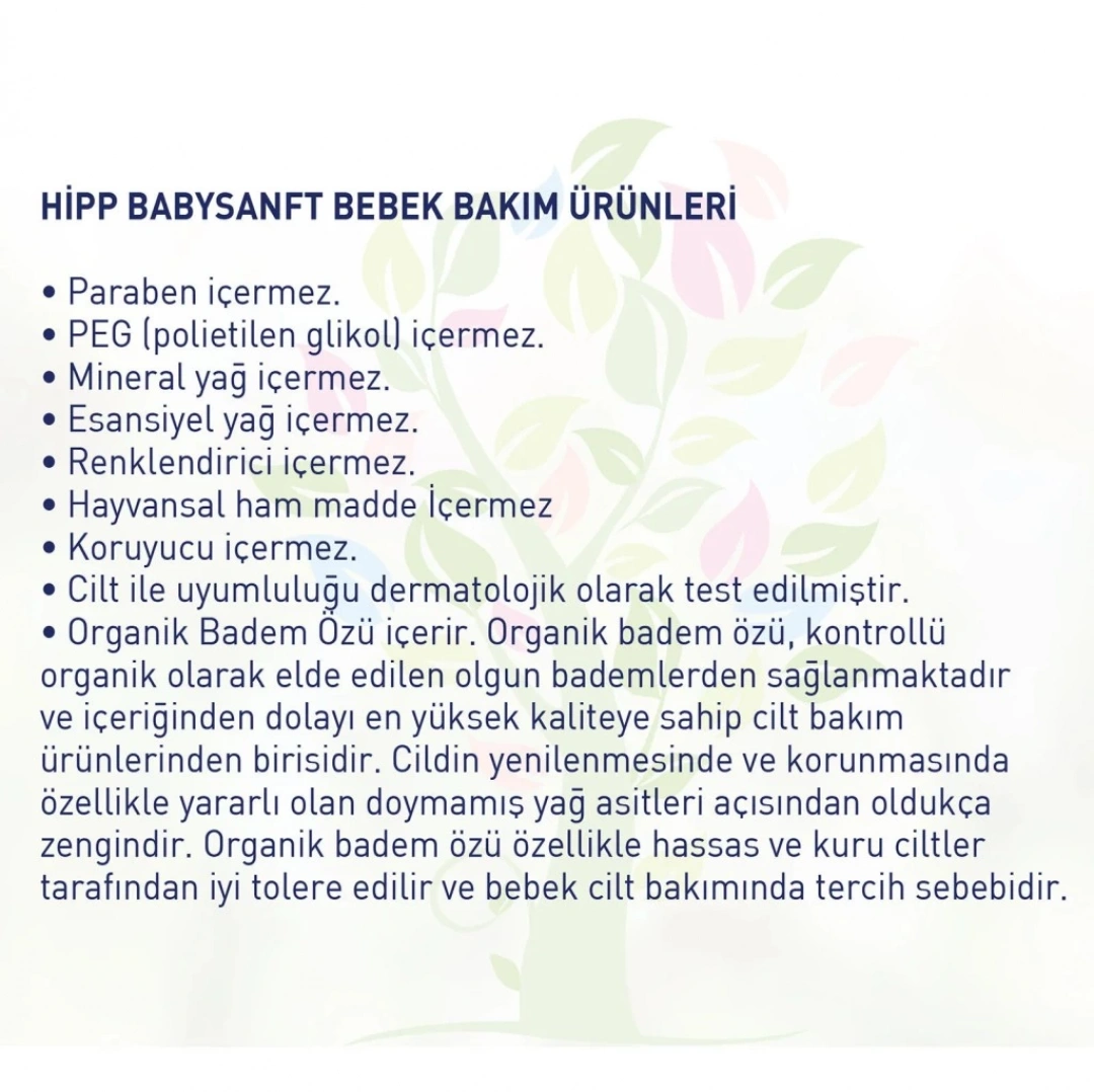 HiPP Babysanft çocuk bakım kremi, küçük çocukların has cildini nemlendirmeye yardımcıdır. Eğlenceli ambalajı sayesinde çocuklara bakım yapma alışkanlığını da kazandırır. Hayvansal ham madde içermez. Paraben içermez. PEG (polietilen glikol) içermez. Renklendirici içermez. Koruyucu içermez. Cilt ile uyumluluğu dermatolojik olarak test edilmiştir. Organik badem yağı, kontrollü organik olarak elde edilen olgun bademlerden sağlanmaktadır ve içeriğinden dolayı en yüksek kaliteye sahip cilt bakım ürünlerinden birisidir. Cildin yenilenmesinde ve korunmasında özellikle yararlı olan doymamış yağ asitleri açısından oldukça zengindir.Ürün görselinde birden fazla renk ve çeşit olduğunda stokta bulunan ve gönderilecek olan ürün için soru sor kısmından bizimle iletişime geçebilirsiniz