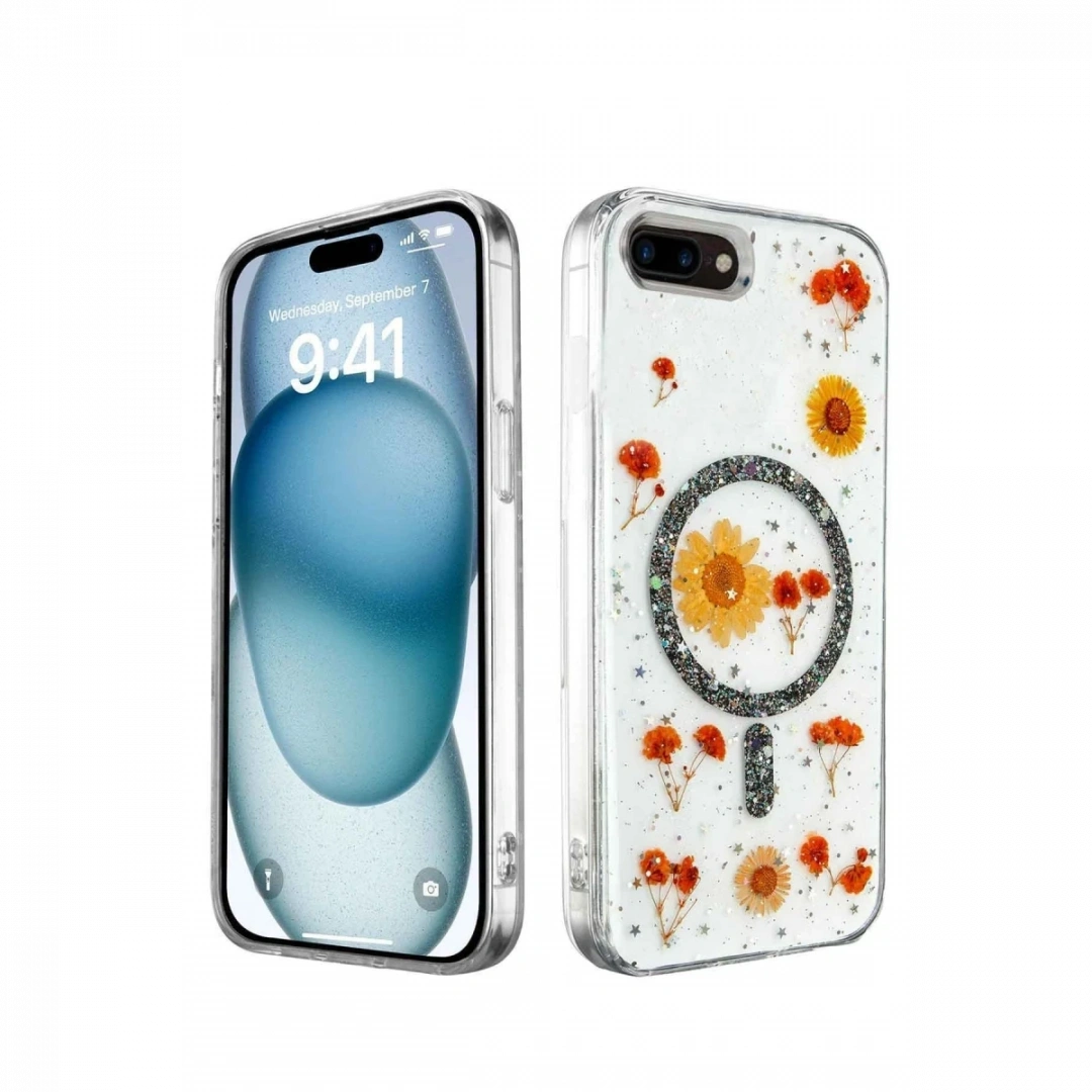 Daisy Simli MagSafe Kapak, doğanın zarafetini ve sadeliğini yansıtan, içinde gerçek çiçeklerin bulunduğu eşsiz bir tasarıma sahiptir. Kapak, içindeki gerçek papatya çiçekleri ve simli arka planı ile cihazınıza doğal bir güzellik katarken, her kapak kendi içinde benzersizdir. Bu, telefonunuzu hem korurken hem de ona kişisel bir dokunuş ekler.