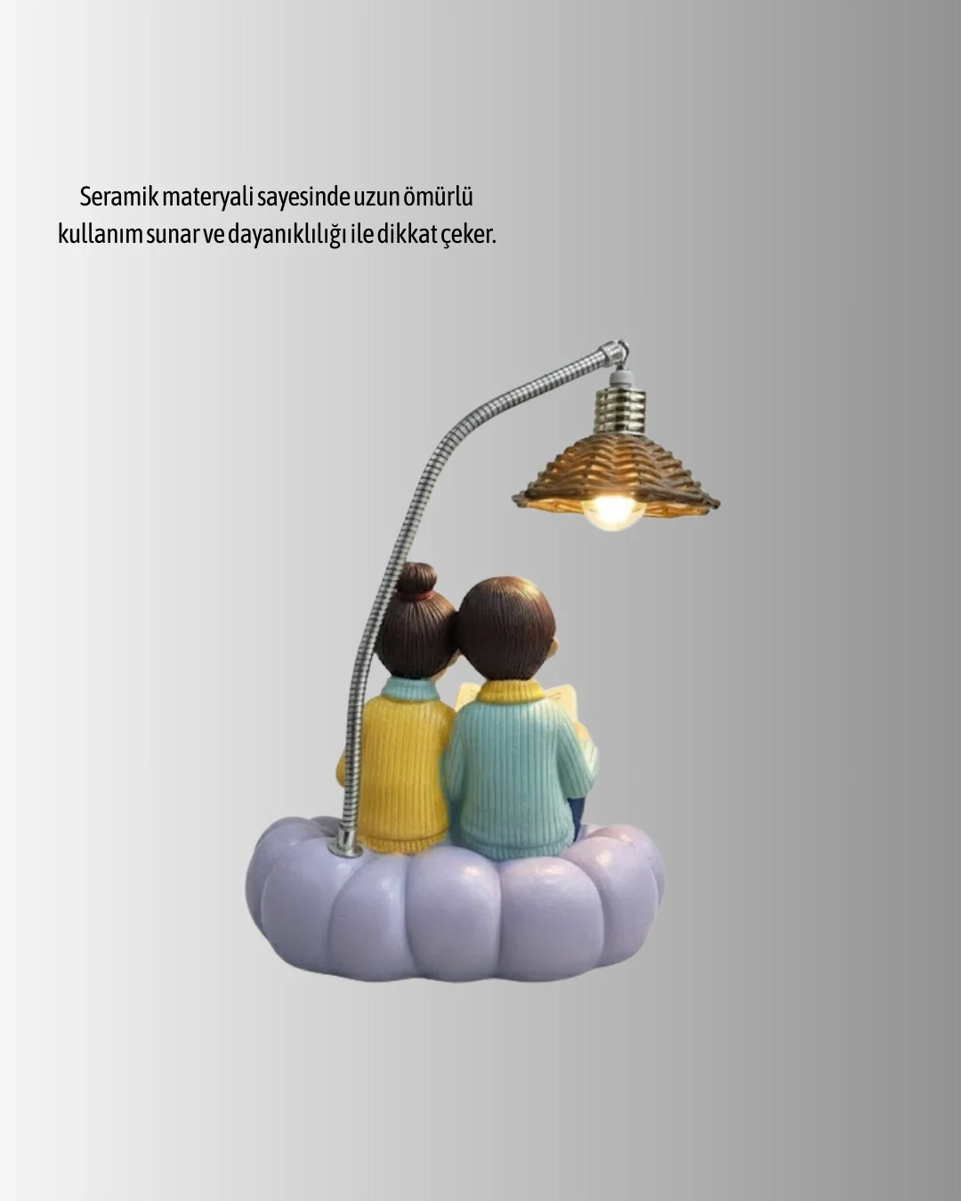 Romantik Çift Figürlü LED Aydınlatmalı Masa Lambası, dekoratif ve işlevsel özellikleriyle öne çıkar. Kitap okuyan çift figürü, huzurlu ve samimi bir atmosfer oluşturur. Yumuşak LED ışığı, gece lambası olarak ideal kullanım sunar.Ürün, masa, komodin ve raflarda rahatlıkla kullanılabilir. Kaliteli reçine malzeme ile üretilmiştir ve uzun süreli kullanım sağlar. Detaylı figür tasarımı sayesinde estetik bir dekoratif objedir.Sevdiklerinize anlamlı ve kalıcı bir hediye sunmak isteyenler için ideal bir seçimdir. Romantik temasıyla ev dekorasyonuna sıcaklık ve zarafet katar.