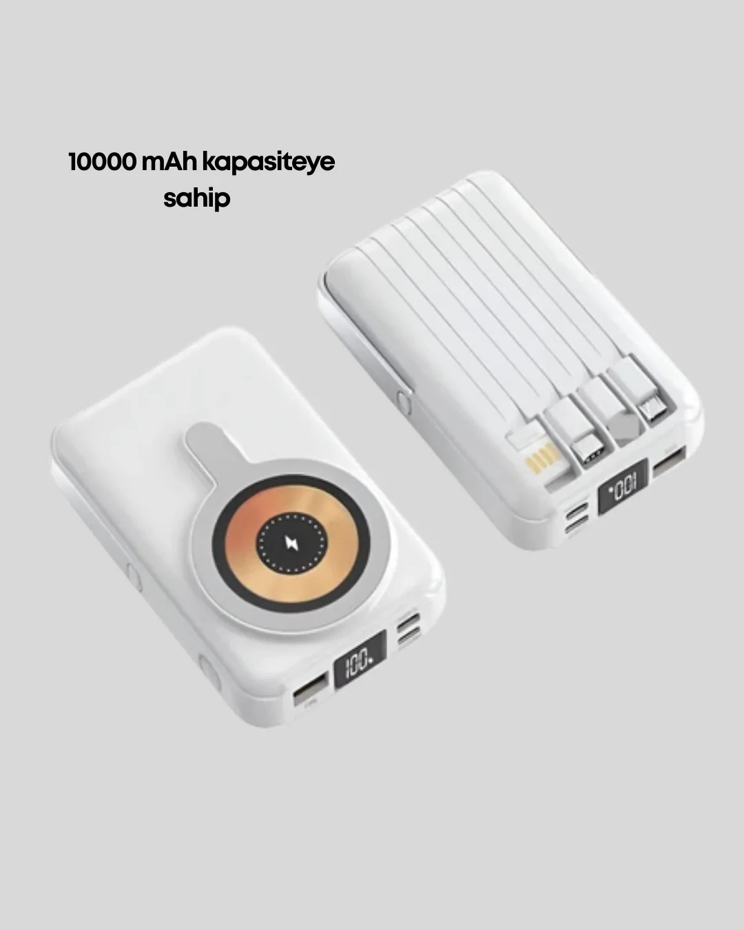 Bu LCD ekranlı powerbank, hem kablosuz hem de kablolu şarj seçenekleri sunarak maksimum esneklik sağlar. Manyetik kablosuz şarj özelliği sayesinde uyumlu telefonlar tek dokunuşla şarj edilmeye başlanır.22.5W hızlı şarj desteği, cihazlarınızı güvenli şekilde kısa sürede doldurur. Dahili çoklu kablo çıkışları sayesinde farklı bağlantı tiplerine sahip cihazlar ekstra kabloya ihtiyaç duymadan şarj edilebilir.Dijital ekran, kalan enerji miktarını net şekilde göstererek kullanıcıya tam kontrol sağlar. Kompakt tasarımı sayesinde seyahatlerde ve günlük kullanımda rahatlıkla taşınabilir.