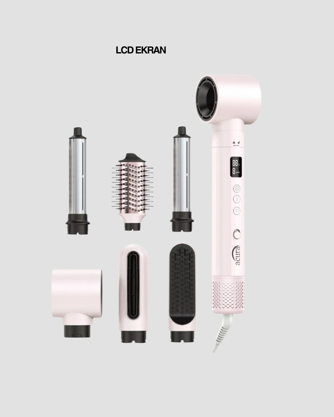 Acura AC-95 Airstyle 6-in-1 Saç Şekillendirme Seti, tek bir cihazla farklı saç stilleri oluşturmak isteyenler için tasarlanmıştır. Yüksek performanslı motoru ve akıllı ısı yönetimi sayesinde saçlarınızı koruyarak şekillendirmenizi sağlar. Profesyonel salon deneyimini ev ortamına taşır.Cihazın güçlü motoru, yüksek hava akışı ile saçların daha kısa sürede kurumasını sağlar. Bu sayede saç telleri uzun süre yüksek ısıya maruz kalmaz ve yıpranma riski azalır. Negatif iyon teknolojisi, saçın doğal nemini muhafaza ederek daha parlak ve sağlıklı bir görünüm sunar.LCD ekran üzerinden kontrol edilebilen sıcaklık ve hız ayarları, kullanım kolaylığı sağlar. 3 farklı sıcaklık ve hız kademesi sayesinde ince, kalın, düz veya dalgalı saçlar için ideal ayarlar yapılabilir. Akıllı sıcaklık kontrol sistemi, saniyede 100 kez ölçüm yaparak saç sağlığını ön planda tutar.Set içeriğinde bulunan çoklu başlıklar, farklı şekillendirme ihtiyaçlarına cevap verir. Bukle başlıkları ile doğal dalgalar, düzleştirme fırçası ile pürüzsüz saçlar, hacimlendirici fırça ile dolgun görünümler elde edebilirsiniz. Oval kurutma başlığı, saçlara yönlü ve kontrollü hava akışı sağlar.Soğuk üfleme fonksiyonu, şekillendirme işlemi sonrası saçın formunu sabitler. Hafif yapısı ve ergonomik tutma alanı sayesinde uzun süreli kullanımda bile rahatlık sunar. 350 gramlık ağırlığı ile bilek yorgunluğunu azaltır.2 yıl garanti güvencesiyle sunulan Acura AC-95 Airstyle, hem günlük kullanım hem de özel günler için ideal bir saç şekillendirme çözümüdür. Saç bakımına önem veren kullanıcılar için fonksiyonellik ve performansı bir arada sunar.