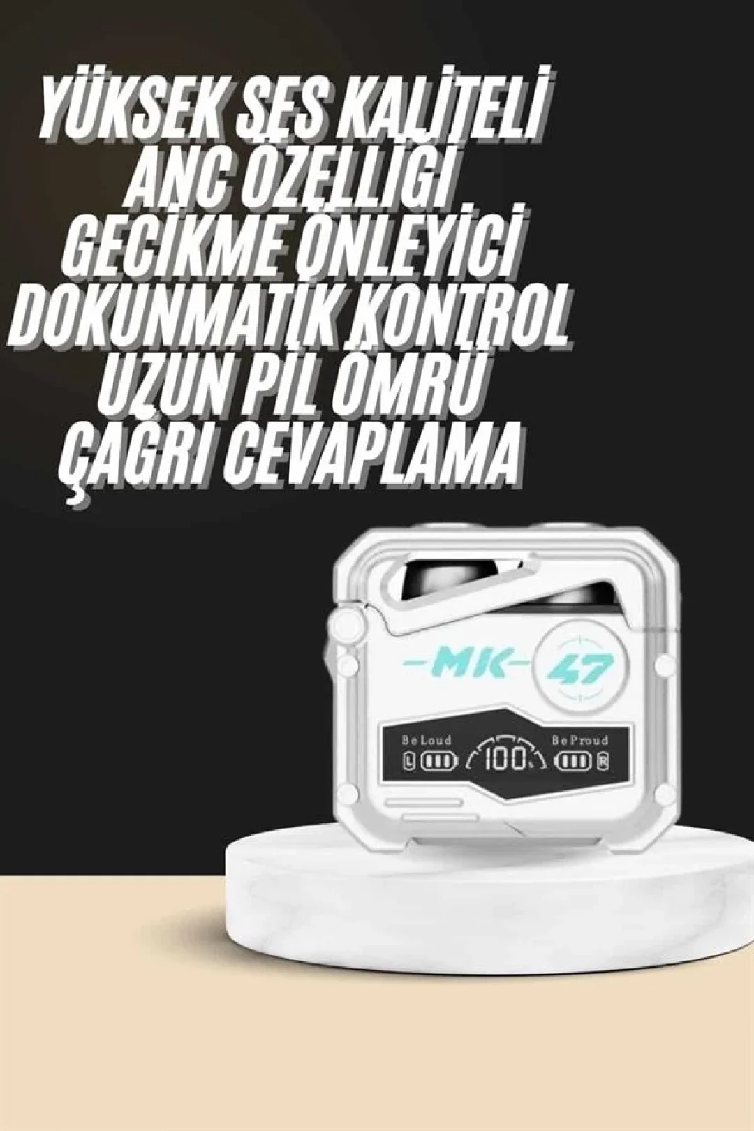 Yüksek Performans, Düşük GecikmeMK47, oyun severler ve müzik tutkunları için tasarlandı. Gelişmiş Bluetooth 5.0 teknolojisi sayesinde 65ms’ye kadar düşen ses gecikmesi ile anlık tepkiler verir, oyunlarda rekabet avantajı sağlar. Otomatik bağlantı özelliği sayesinde kutudan çıkar çıkmaz kullanıma hazırdır.Derin Bas & Net Ses Kalitesi6mm dinamik bobin sürücülerle donatılan kulaklıklar, güçlü baslar ve net tizlerle üstün bir ses deneyimi sunar. SBC ve AAC çift ses kodlama desteği ile her frekansta dengeli bir ses alırsınız.Uzun Süreli Kullanım, Hızlı ŞarjKulaklık başına 4-5 saat kesintisiz kullanım süresi, 400mAh kapasiteli şarj kutusu ile toplamda 20 saate kadar müzik ve oyun keyfi. Type-C hızlı şarj desteği sayesinde sadece 45 dakikada tam şarj olur.Konforlu Tasarım ve Su Direnci45° ergonomik kulak içi tasarım, hafif yapısı ve cilt dostu silikon uçlarla uzun süreli kullanımda bile rahatsızlık vermez. IPX5 suya dayanıklılık seviyesi sayesinde yağmurlu havalarda veya spor yaparken güvenle kullanılabilir.Öne Çıkan Özellikler: Dokunmatik kontrol ile kolay kullanım Aktif gürültü engelleme ve arka plan ses izolasyonu Otomatik açılma, eşleşme ve kapanma Oyun/Müzik modu geçişi (3 kez dokunarak) Kulaklık başına sadece 4g ağırlık Binaural (çift kulaklık) arama desteği Kararlı bağlantı için 10 metreye kadar kapsama alanıTeknik Bilgiler: Model: MK47 Bluetooth Sürüm: 5.0 Kulaklık Kapasitesi: 40mAh Şarj Kutusu Kapasitesi: 400mAh Kullanım Süresi: 4-5 saat Şarj Süresi: 45 dk (kulaklık) / 1.2 saat (kutusu) Hoparlör: 6mm dinamik bobin Frekans Aralığı: 20Hz – 20kHz Su Geçirmezlik: IPX5 Ağırlık: Kulaklık 4g / Kutusu 64g