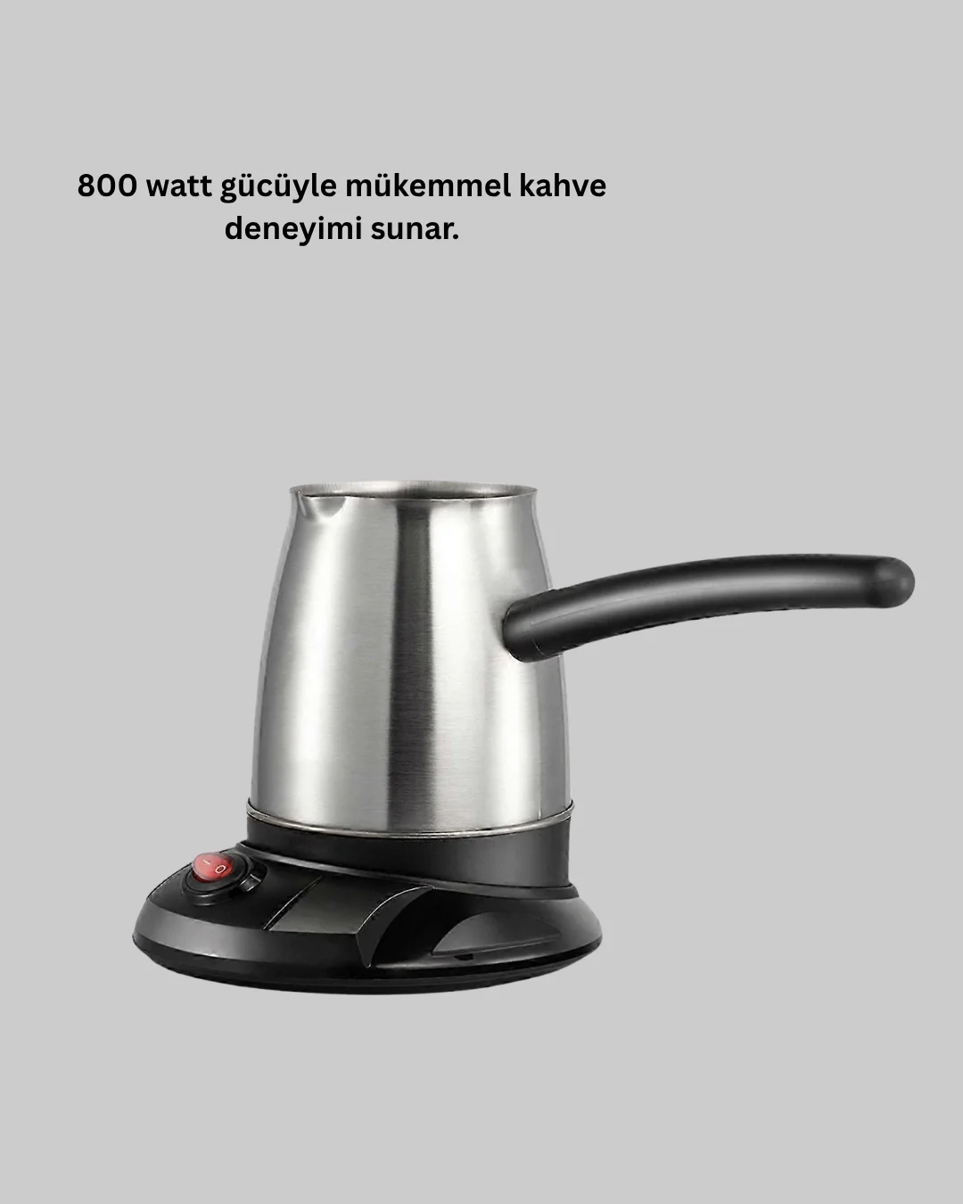 Kahve keyfini teknolojiyle buluşturan bu 800W gücündeki elektrikli cezve, mükemmel Türk kahvesi deneyimi sunmak için tasarlandı.300 ml kapasitesi sayesinde tek seferde 6 fincana kadar kahve hazırlayabilir, dostlarınızla keyifli kahve sohbetleri yapabilirsiniz.Gizli rezistans teknolojisi, cezvenin tabanını pürüzsüz hale getirir; bu da hem güvenli pişirme hem de kolay temizlik avantajı sağlar.360° dönebilen kablosuz tabanı, cezveyi her yönden rahatça kaldırıp kullanmanızı sağlar.Paslanmaz çelik gövdesi, uzun ömürlü, sağlam ve estetik bir yapı sunarken mutfağınıza modern bir hava katar.Isınmayan ergonomik kulp, güvenli kullanım sağlar.Kırmızı güç düğmesiyle kolay açma-kapama imkanı sunar.Hem pratik hem de şık bu cezve, günlük kahve hazırlığınızı zahmetsiz hale getirir.Geleneksel Türk kahvesinin kokusunu, modern teknolojinin konforuyla yaşamak isteyenler için mükemmel bir tercihtir.