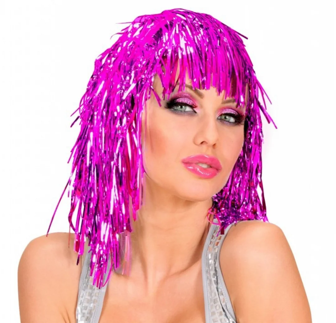 Feminen ve enerjik görünümün anahtarı metalize fuşya peruk ile ışıltınızı ortaya çıkarın! Parlak folyo yapısı, ışık altında dikkat çekici bir görünüm sunar. Eğlenceli davetler ve özel günler için mükemmel bir tamamlayıcıdır.