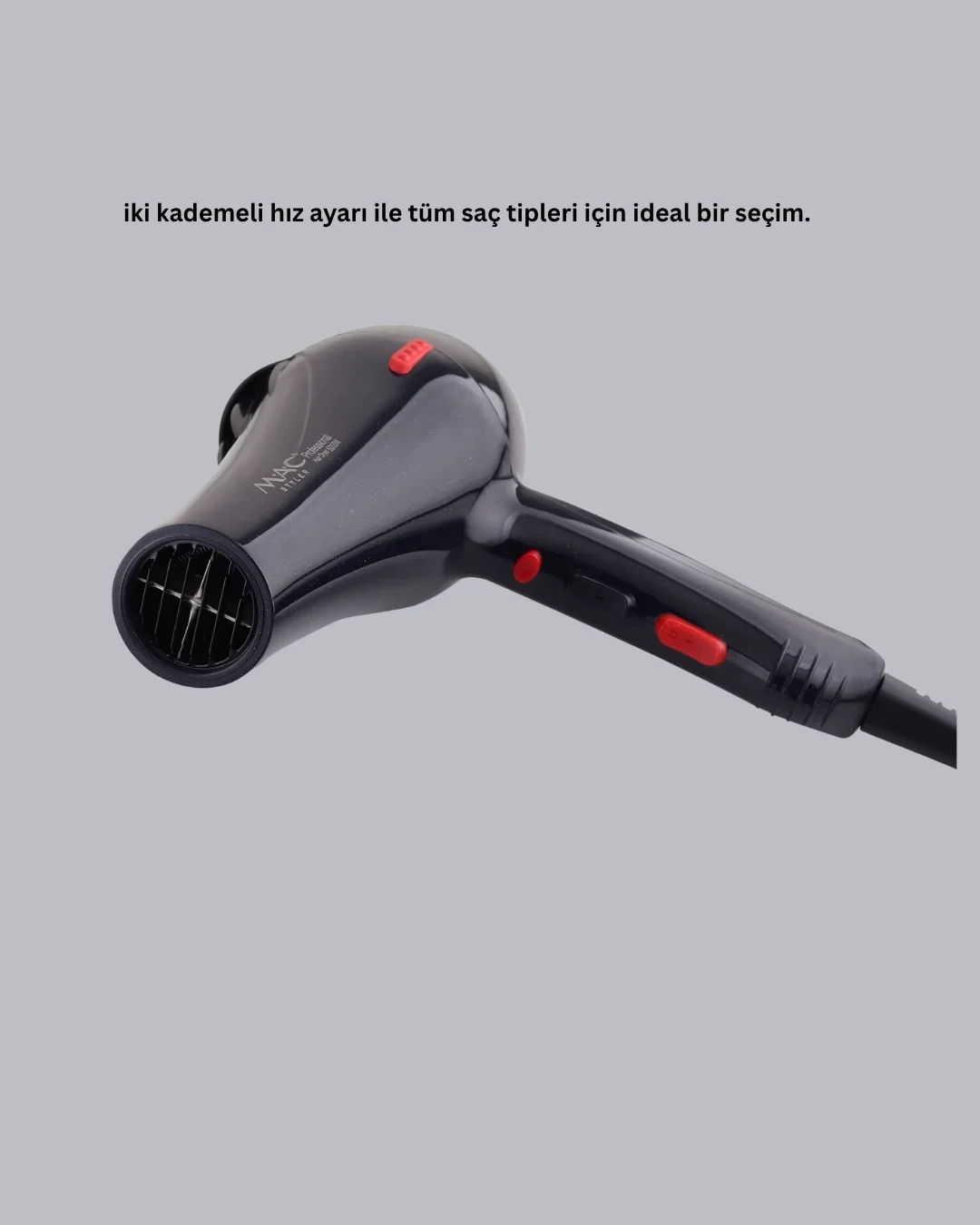 2200 Watt AC motorlu Profesyonel Saç Kurutma Makinesi, güçlü hava akımı ve uzun ömürlü yapısıyla saç kurutma ve şekillendirme deneyiminizi üst seviyeye taşır. Profesyonel kuaförlerde kullanılan motor teknolojisi sayesinde hızlı ve yüksek performanslı üfleme sağlar. İki kademeli hız ayarı ile saç tipinize ve ihtiyacınıza göre hava akımını kolayca ayarlayabilirsiniz. Sıcak ve soğuk üfleme özellikleri sayesinde hem kısa sürede saç kurutabilir hem de yaptığınız fön işlemini sabitleyebilirsiniz.Cihazın ergonomik tasarımı kullanım sırasında maksimum konfor sağlar. Hafif gövde yapısı sayesinde el yorulmasını engeller ve uzun süreli kullanımlarda bile rahatlık sunar. Hem ev hem profesyonel kullanım için uygun olan bu saç kurutma makinesi, taşınabilir yapısıyla sık seyahat eden kullanıcılar için de idealdir. Gövdesi yüksek kaliteli malzemelerden üretildiği için yıllar boyunca dayanıklılığını korur.Profesyonel dar ağızlı başlık aparatı sayesinde hava akışını tek noktaya odaklayarak daha etkili şekillendirme sağlar. Bu özellik özellikle düzleştirme, hacim verme ve kabarıklığı azaltma işlemlerinde önemli avantaj sunar. Güçlü ve sürekli hava akımı saç tellerini daha parlak, canlı ve hacimli görünüme kavuşturur.Soğuk üfleme fonksiyonu saç şeklinizi sabitleyerek uzun süre kalıcı sonuçlar elde etmenizi sağlar. Mükemmel bir fön deneyimi sunan bu cihaz, ısı kontrolü sayesinde saçın yıpranmasını engeller ve sağlıklı şekillendirme sağlar. Motorunun sessiz çalışması sayesinde kullanım sırasında konforu artırır. 2200W gücündeki bu profesyonel saç kurutma makinesi, hız, güç ve ergonomiyi bir arada sunan ideal bir seçenektir.