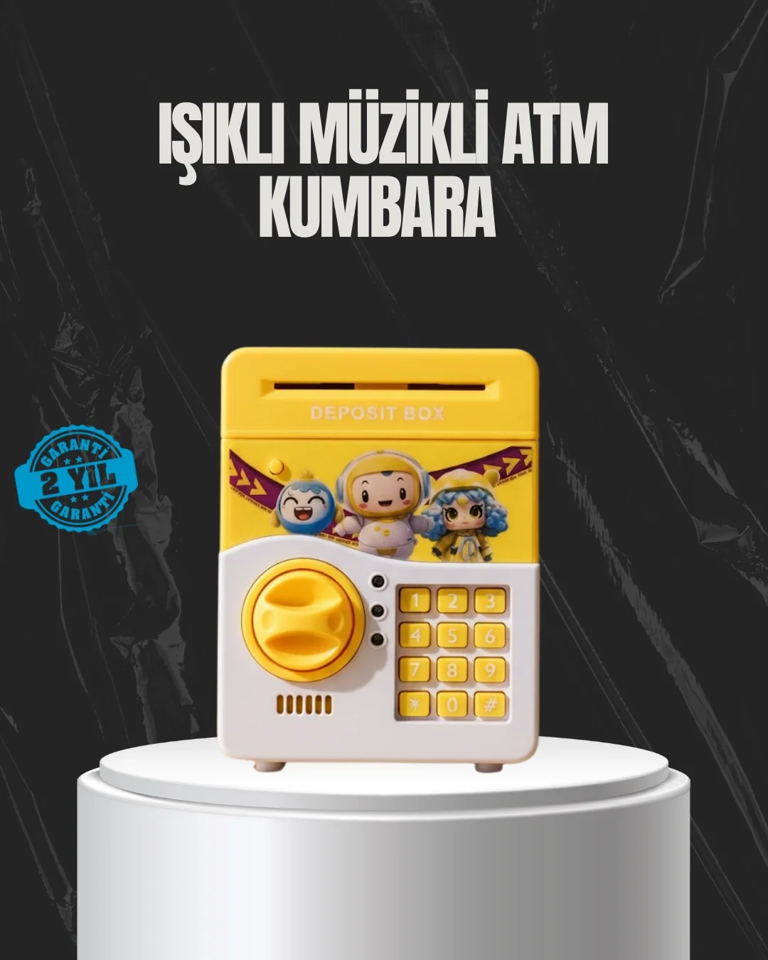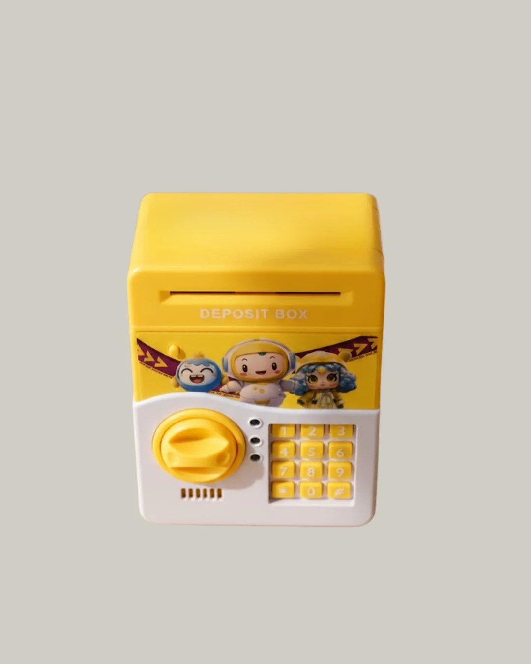 Canlı sarı rengi ve eğlenceli tasarımıyla öne çıkan bu sarı ATM görünümlü elektronik kumbara, çocukların para biriktirme alışkanlığını küçük yaşta kazanmasını destekler. Elektronik şifre sistemi sayesinde çocuklar kendilerine ait özel bir şifre belirleyebilir ve paralarını güvenle saklayabilir. Bu sistem, çocuklara kişisel sorumluluk ve güvenlik bilinci kazandırır.Kumbara, gerçek bir ATM gibi çalışacak şekilde tasarlanmıştır. Kâğıt paralar hazneye yaklaştırıldığında otomatik olarak içeri çekilirken, bozuk paralar da rahatlıkla kabul edilir. Otomatik para girişi, ürünü sıradan kumbaralardan ayıran en eğlenceli özelliklerden biridir. Yüksek kapasiteli iç hacmi sayesinde çocuklar uzun süre para biriktirebilir.Işıklı ve sesli efektler, her tuş basımında aktif hale gelir ve kullanım deneyimini keyifli hale getirir. Sarı renkli tasarımı, çocuk odalarına enerji katar ve dekoratif bir görünüm sunar. Dayanıklı ABS plastik gövdesi, güvenli ve uzun ömürlü kullanım sağlar.Eğitici ve eğlenceli yapısıyla bu kumbara, doğum günü, bayram ve karne hediyesi olarak ideal bir tercihtir. Çocukların hem eğlenmesini hem de tasarruf bilinci kazanmasını sağlar.