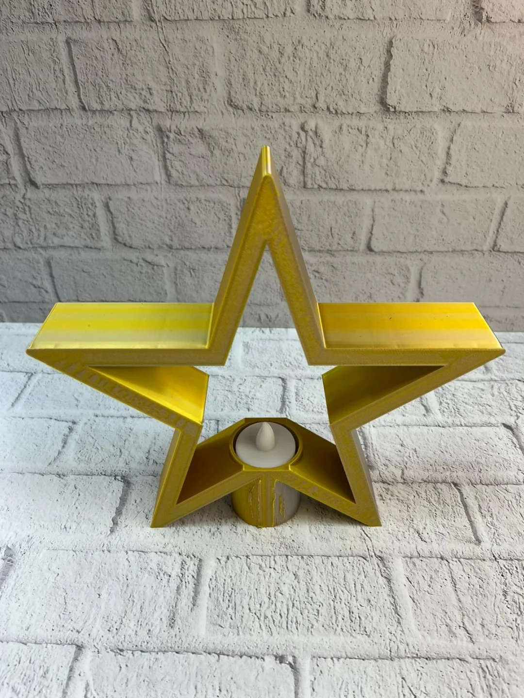 Sarı yıldız mumluk, canlı rengi ve modern tasarımıyla dekorasyona enerjik bir dokunuş katar. 21×23 cm ölçüsü sayesinde raf, masa, şifonyer veya TV ünitesi üzerinde rahatlıkla sergilenebilir. Mum ışığıyla birleştiğinde loş ve sıcak bir atmosfer oluşturarak salon ve oturma alanlarında samimi bir ambiyans yaratır. Hem tek başına hem de diğer dekoratif objelerle birlikte kullanılabilir.