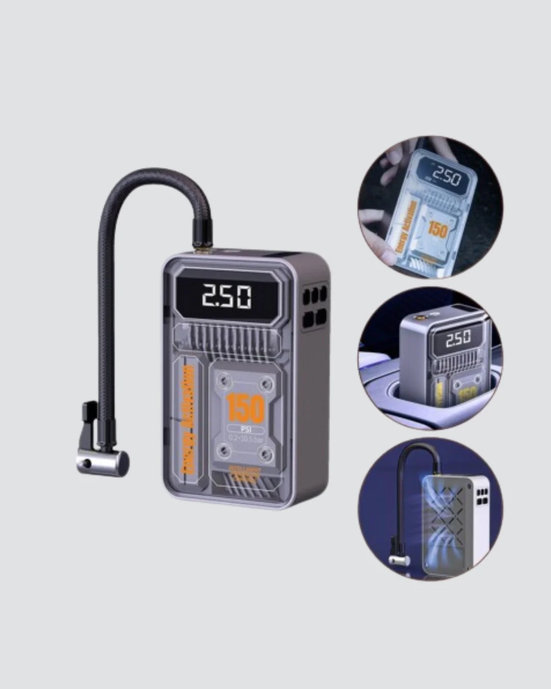 Bu taşınabilir kablosuz hava pompası, 150 PSI basınç gücüyle otomobil, motosiklet, bisiklet ve top gibi farklı ekipmanları kolayca şişirebileceğiniz çok yönlü bir cihazdır. Kompakt yapısı (82x45x134 mm) sayesinde torpido gözüne, çantanıza veya araç kol dayama kutusuna rahatlıkla sığar.Güçlü 60W motoru ve 30000 RPM hızıyla otomobil lastiğini 8-10 dakika içinde 0’dan 30 PSI seviyesine kadar şişirebilir. Tam şarj edildiğinde 6000mAh bataryası ile 4 lastiğe kadar kullanım sağlar.Üzerindeki LED ekran, basınç seviyesini anlık olarak gösterir. Dilerseniz hedef basıncı önceden ayarlayabilir ve pompa otomatik olarak durduğunda güvenli bir şekilde işlem tamamlanır.Otomatik kapanma özelliği fazla şişirmeyi önler. Kablosuz kullanımı sayesinde hareket özgürlüğü sağlar; elektrik bağlantısı aramanıza gerek kalmadan her yerde kullanabilirsiniz.Araç sahipleri, bisiklet sürücüleri ve spor tutkunları için ideal bir acil durum çözümüdür.