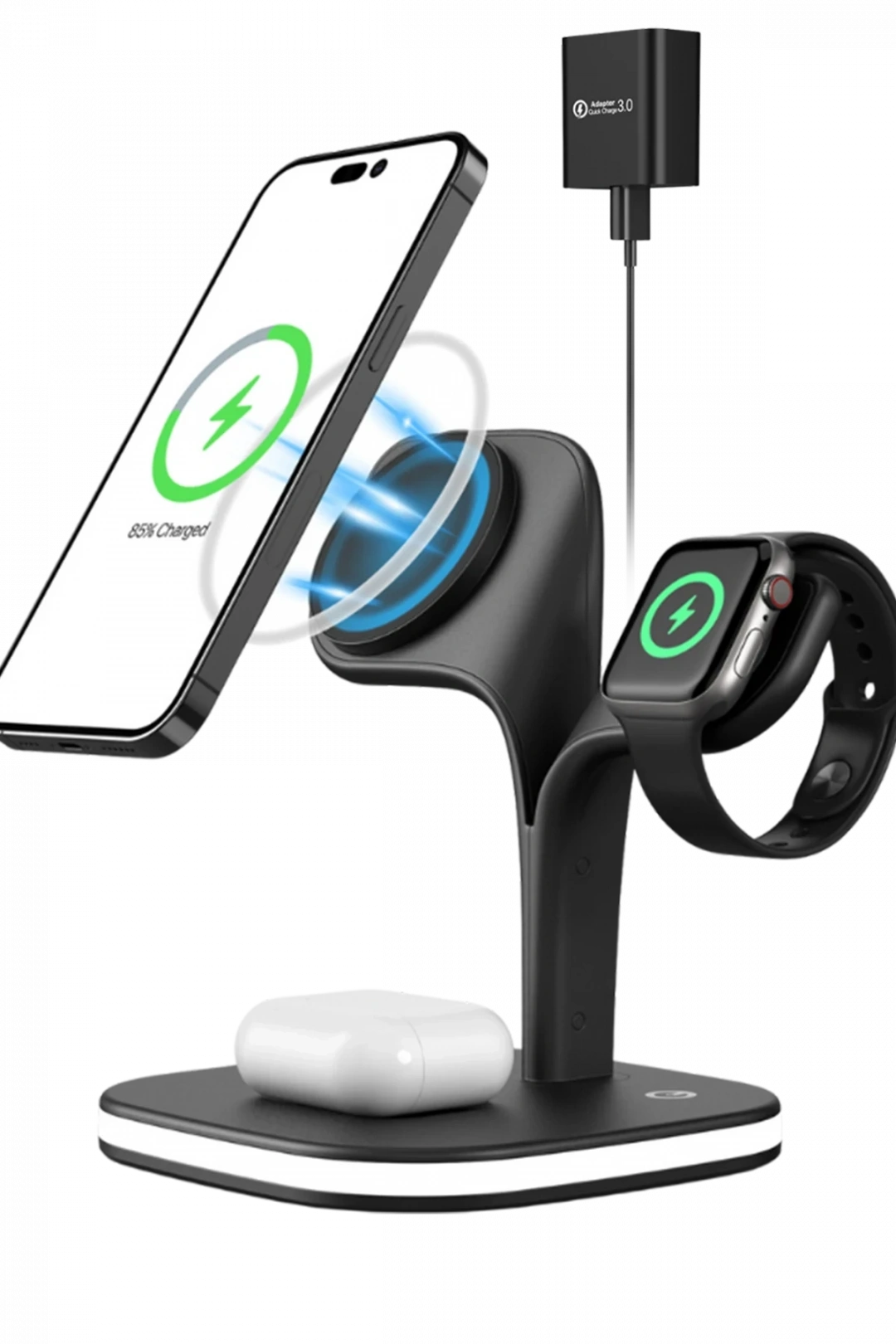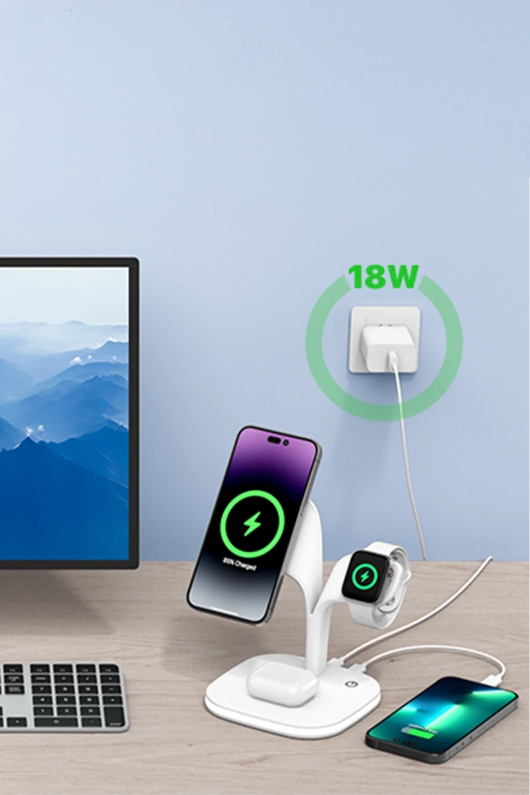 Phone, AirPods, iWatch ve ek Qi uyumlu cihazları aynı anda şarj ederek verimliliğinizi artırır.
