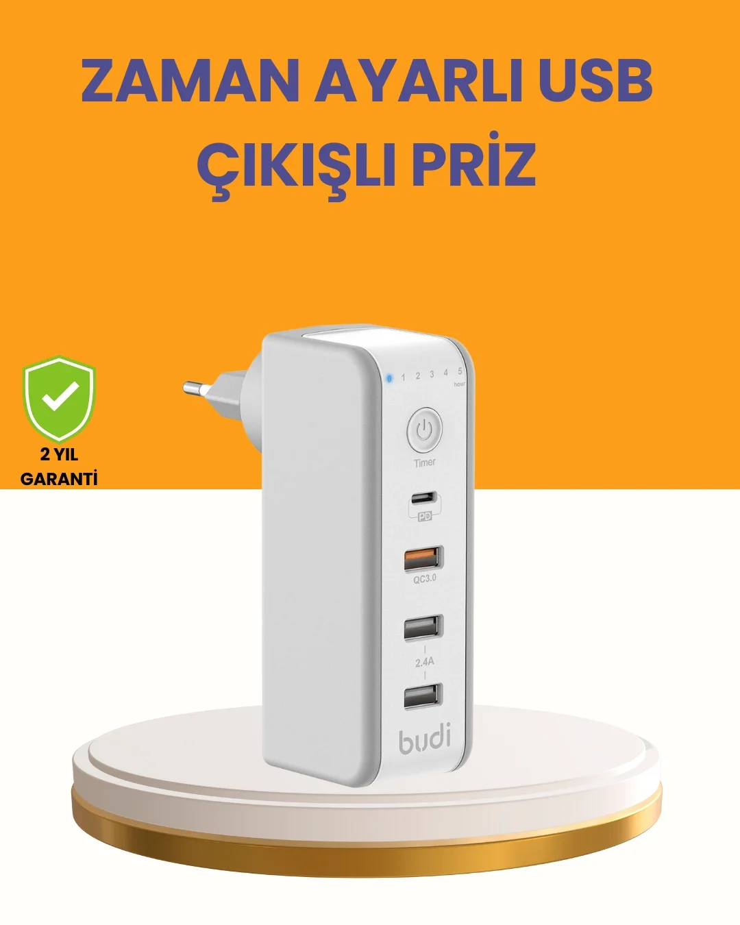 Zaman kontrollü şarj cihazı, birden fazla cihazı aynı anda güvenli ve verimli şekilde şarj etmek isteyen kullanıcılar için geliştirilmiş çok yönlü bir çözümdür. 30W güç dağıtımı sunan Type-C bağlantı noktası sayesinde akıllı telefonlar, tabletler ve diğer mobil cihazlar hızlı ve dengeli şekilde şarj edilebilir. 3.0 hızlı şarj desteği, uyumlu cihazlarda daha kısa sürede yüksek performanslı şarj imkânı sunar. Buna ek olarak yer alan 2.4A çift USB çıkışları, birden fazla cihazın aynı anda sorunsuz şekilde şarj edilmesini sağlar.Zamanlama özelliği sayesinde şarj sürecini tamamen kontrol altına alabilirsiniz. Manuel zamanlayıcı seçenekleri ile 1 saatten 5 saate kadar farklı şarj süreleri ayarlanabilir. Belirlenen süre sonunda güç otomatik olarak kesilir ve cihazların gereksiz yere prizde kalması önlenir. Bu sistem, batarya sağlığını korumaya yardımcı olurken aynı zamanda enerji tasarrufu sağlar.Gelişmiş akıllı devre çipi; aşırı akım, aşırı ısınma ve aşırı şarj gibi risklere karşı tam koruma sunar. Bu sayede hem şarj edilen cihazlar hem de kullanıcı için güvenli bir kullanım deneyimi sağlanır. Evde, ofiste veya seyahat sırasında rahatlıkla kullanılabilecek kompakt yapısı ile günlük hayatın vazgeçilmez yardımcılarından biri olur.Zaman kontrollü şarj cihazı, düzenli ve bilinçli şarj alışkanlığı oluşturmak isteyen kullanıcılar için ideal bir tercihtir.