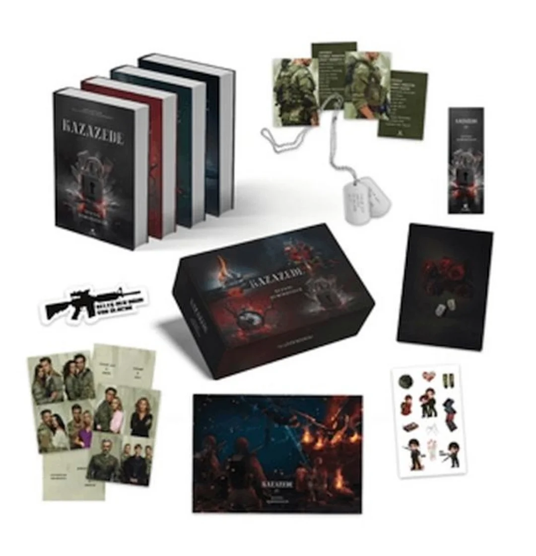 Kazazede – 1 ciltli (poster, ayraç, 2 adet tim kartı) Kazazede – 2 ciltli (poster, ayraç, 2 adet tim kartı) Kazazede – 3 ciltli (poster, ayraç, 3 adet tim kartı) Kazazede – 4 ciltli (poster, ayraç, 2 adet tim kartı) Defter Özel kesim ayraç Sticker set 2 adet 4’lü kart Künye kolye
