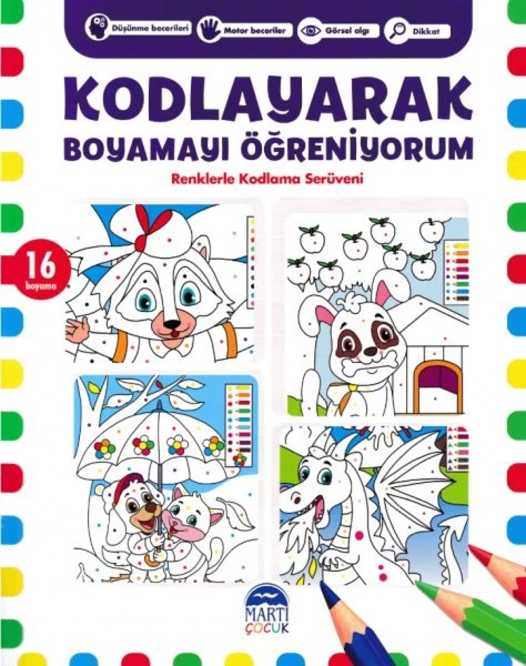 Kodlayarak Boyamayı Öğreniyorum kitapları öğrenmeyi eğlenceli bir hale getiriyor. Çocuklar boyama yaparken aynı zamanda şekilleri, harfleri, sayıları ve renkleri öğrenecekler.