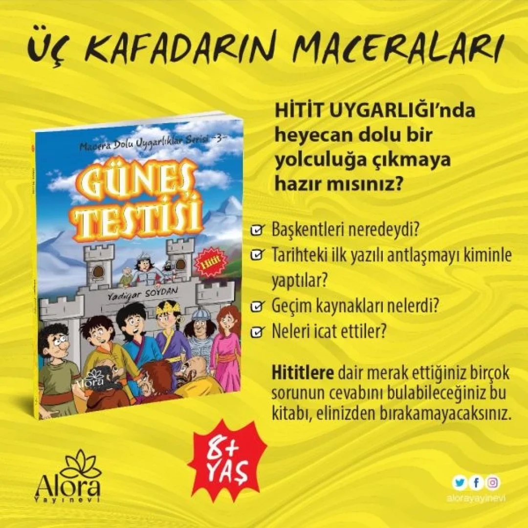 MACERA-GÜNEŞ TESTİSİ (HİTİT) • MACERA DOLU UYGARLIKLAR SERİSİ (MEB MÜFREDATINA UYUMLU) Üç kafadar Mete, Ege ve Ada, arkadaşların piknikte başlayan silindir bir cihazla ortadan kaybolmaları ile Antik Uygarlık dönemlerine macera dolu geçmişe yolculuk yaparlar • MISIR, SÜMER, HİTİT, BABİ ve URARTU dönemlerin deki tarihi olayları, gerçekleşen buluşları akıllarında kalıcı maceralarla öğreniyorlar. - HİTİT UYGARLIĞINA GİTTİKLERİNDE Tarihteki ilk yazılı antlaşmayı kimlerle yaptılar? Başkenti neresiydi? Geçim kaynakları nelerdi? Neleri icat ettiler? Güneş testisinde ne bulunurdu ve ne işe yarardı? Bunları öğrenirken kaybolan Testiyi bulmak için peşine giderken heyecan dolu macera yaşıyorlar. Serinin diğer kitapları ile Uygarlık dönemlerine ait akla gelen tüm buluşları ve bilgileri yaşadıkları maceralarla öğreniyorlar. Sizde serinin diğer kitaplarını okumayı unutmayın!!!