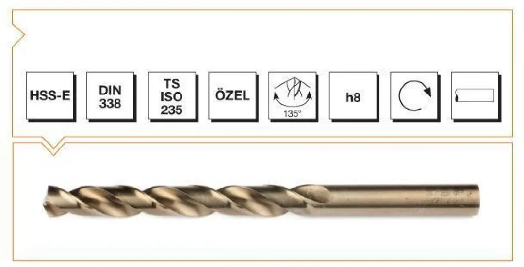 SİLİNDİRİK SAPLI ALTIN SERİ 5 MM MATKAP UCU TS ISO 235, HSSE %5 Co alaşımlı yüksek hız çeliği, özel profil, uç açısı 135°, çap toleransı h8, sağ kesme yönlü