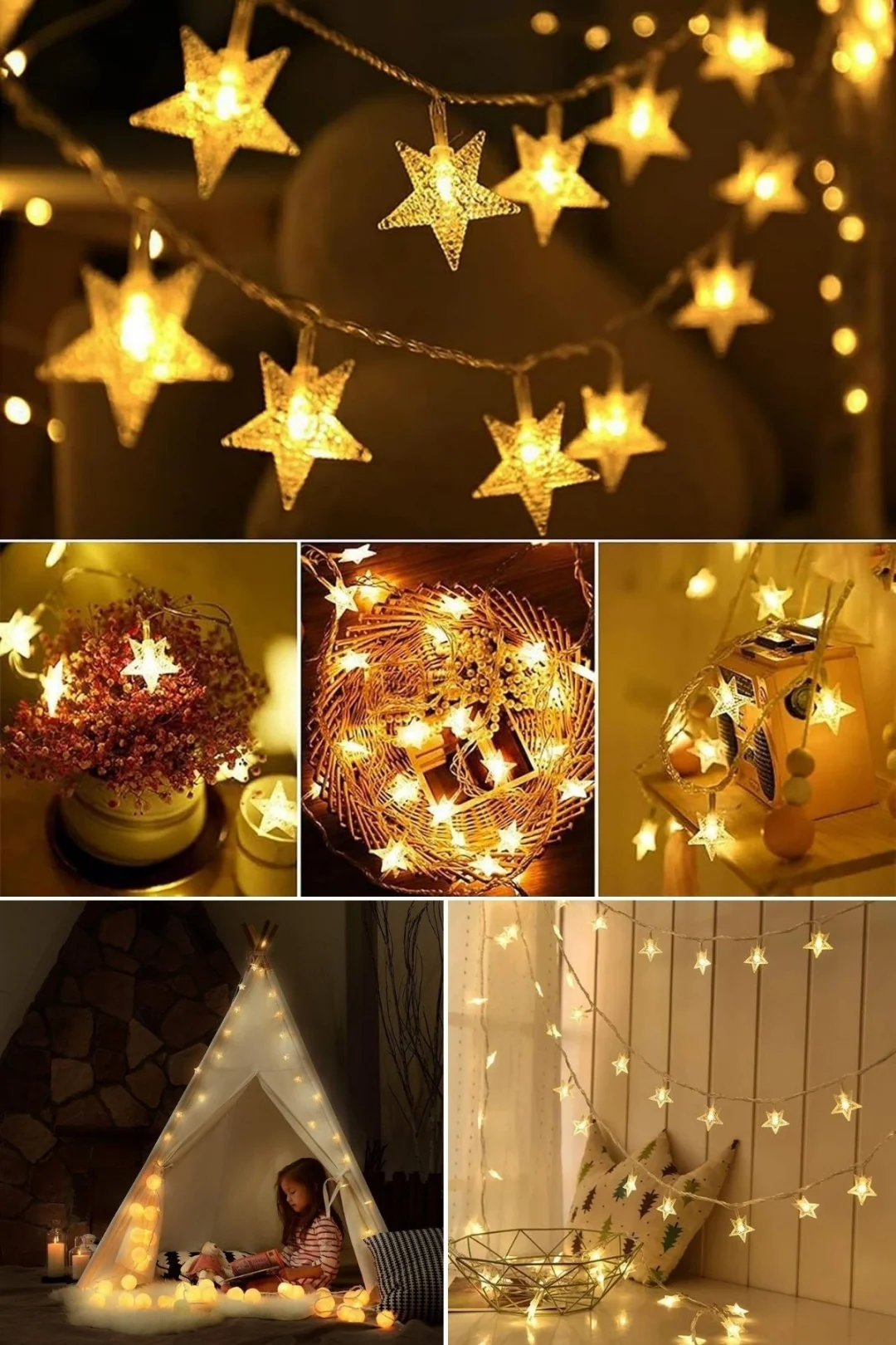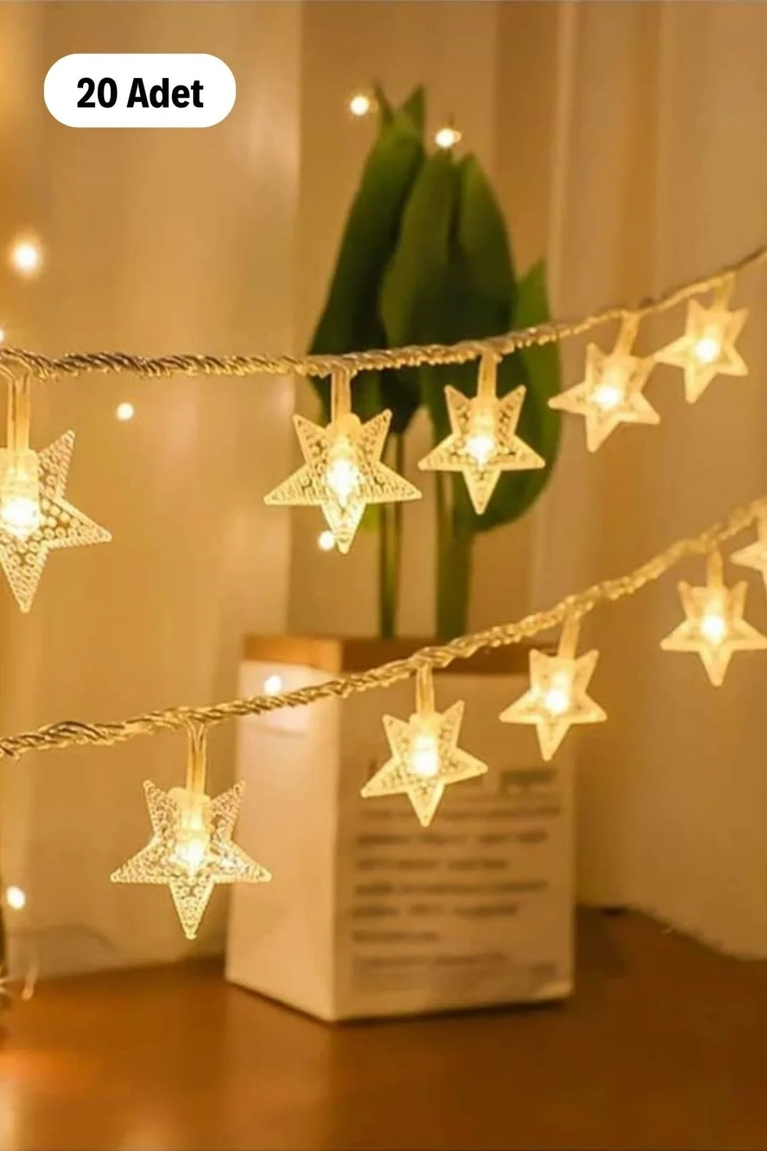 Dekoratif Aydınlatma: Yıldız şekilli 20 LED ampul, 5 metre uzunluğunda kablo üzerinde eşit aralıklarla dizilmiştir.