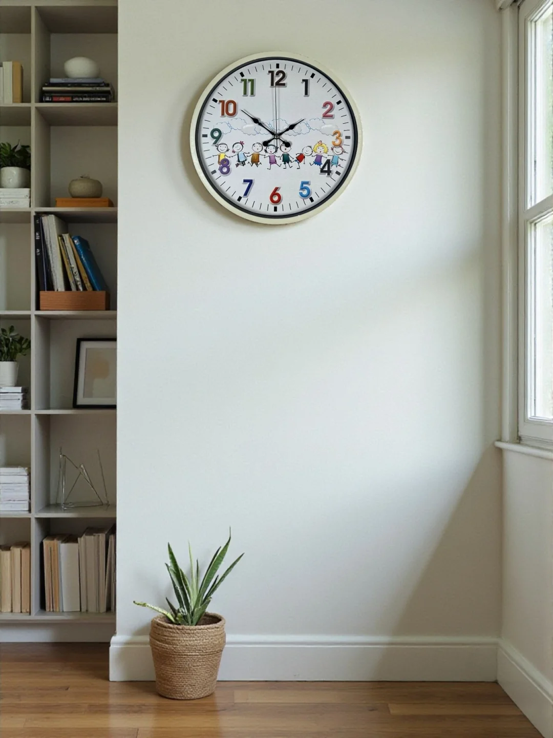 Yumuşak krem çerçevesi ve çocuklara hitap eden sade kadran tasarımıyla bu 36 cm çocuk odası duvar saati, hem dekoratif hem de eğitici bir kullanım sunar. Net ve okunaklı rakamları sayesinde çocukların saati kolayca öğrenmesine yardımcı olurken, pastel tonlarıyla odada huzurlu ve sıcak bir atmosfer oluşturur.