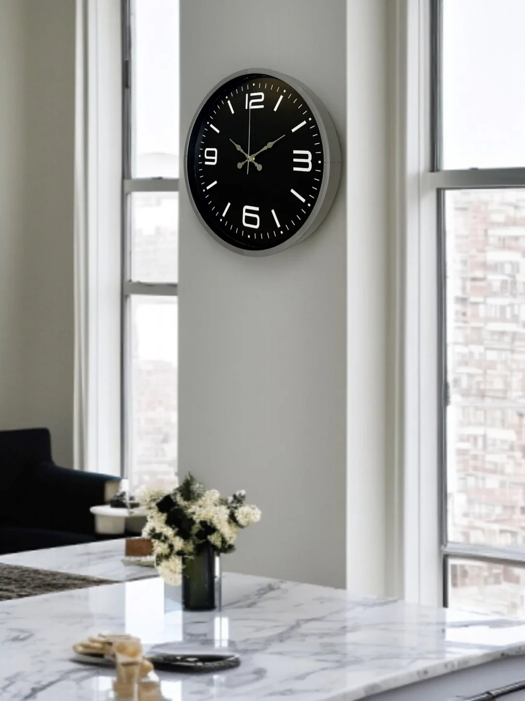 Siyah kadranı, kontrast oluşturan beyaz rakamları ve gri çerçevesiyle tasarlanan bu 36 cm duvar saati; modern, sade ve güçlü bir duruş sunar. Net rakam yapısı sayesinde uzaktan bile kolayca okunur ve günlük kullanımda pratiklik sağlar.