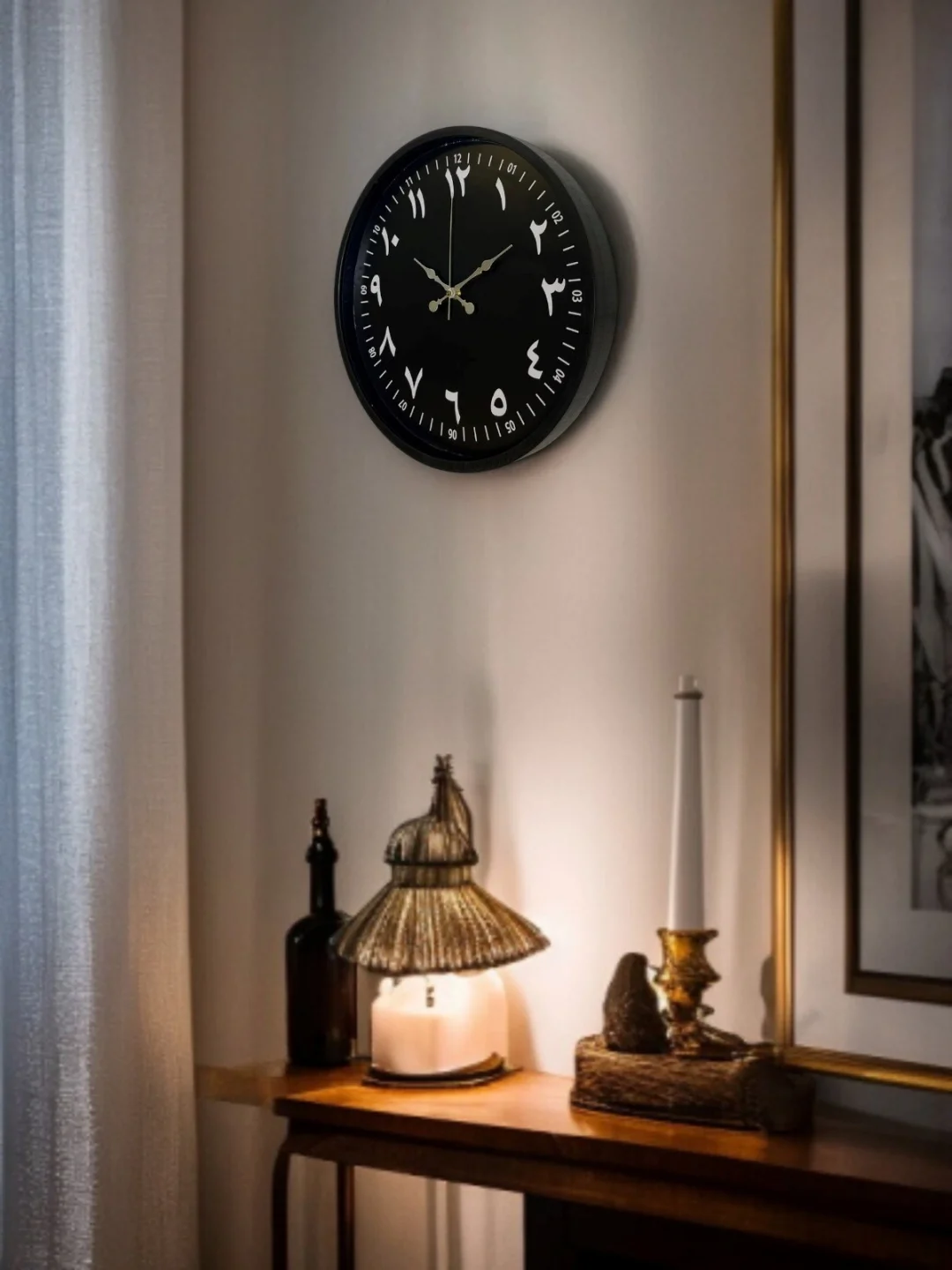 Siyah kadranı üzerinde yer alan beyaz Arapça rakamlarıyla tasarlanan bu 36 cm duvar saati, klasik çizgileri modern bir yorumla sunar. Arapça rakam kullanımı saate farklı bir karakter kazandırırken, beyaz rakamların siyah zeminle oluşturduğu kontrast sayesinde yüksek okunurluk sağlar.