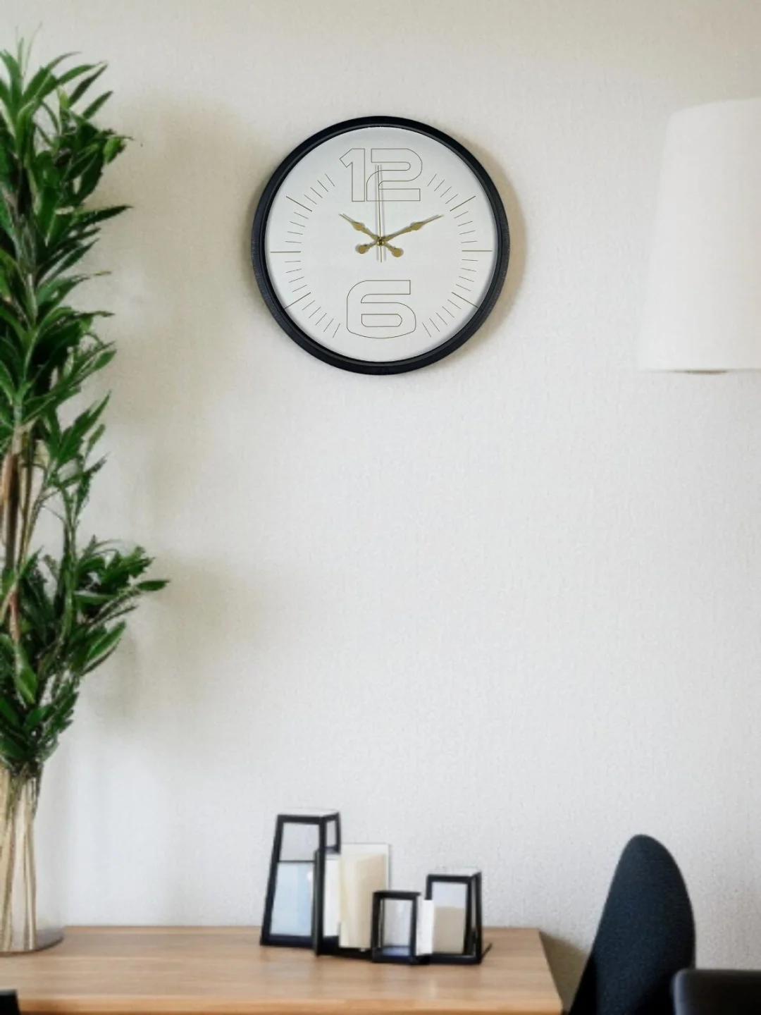Siyah çerçevesi ve açık renk kadranıyla kontrast oluşturan bu 36 cm duvar saati, modern dekorasyon anlayışını yansıtan özel bir tasarıma sahiptir. Büyük 12 ve 6 rakam detayı, saate karakter kazandırırken minimal çizgilerle desteklenen kadran yapısı sayesinde sade ama güçlü bir görünüm sunar.