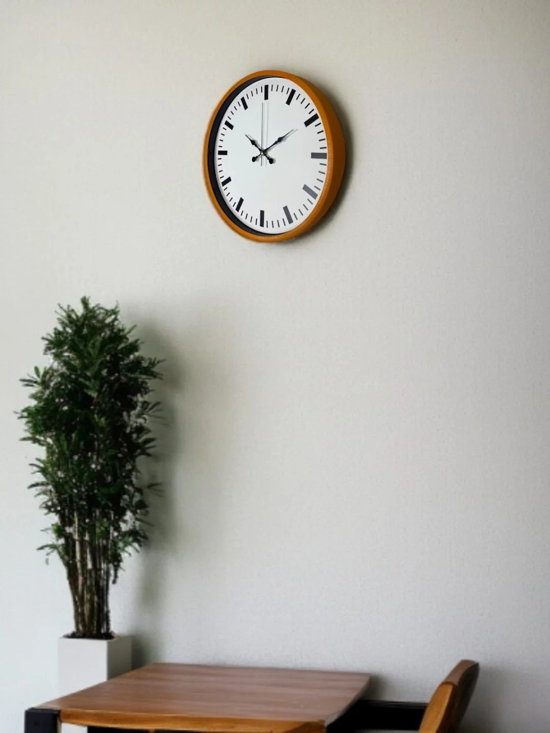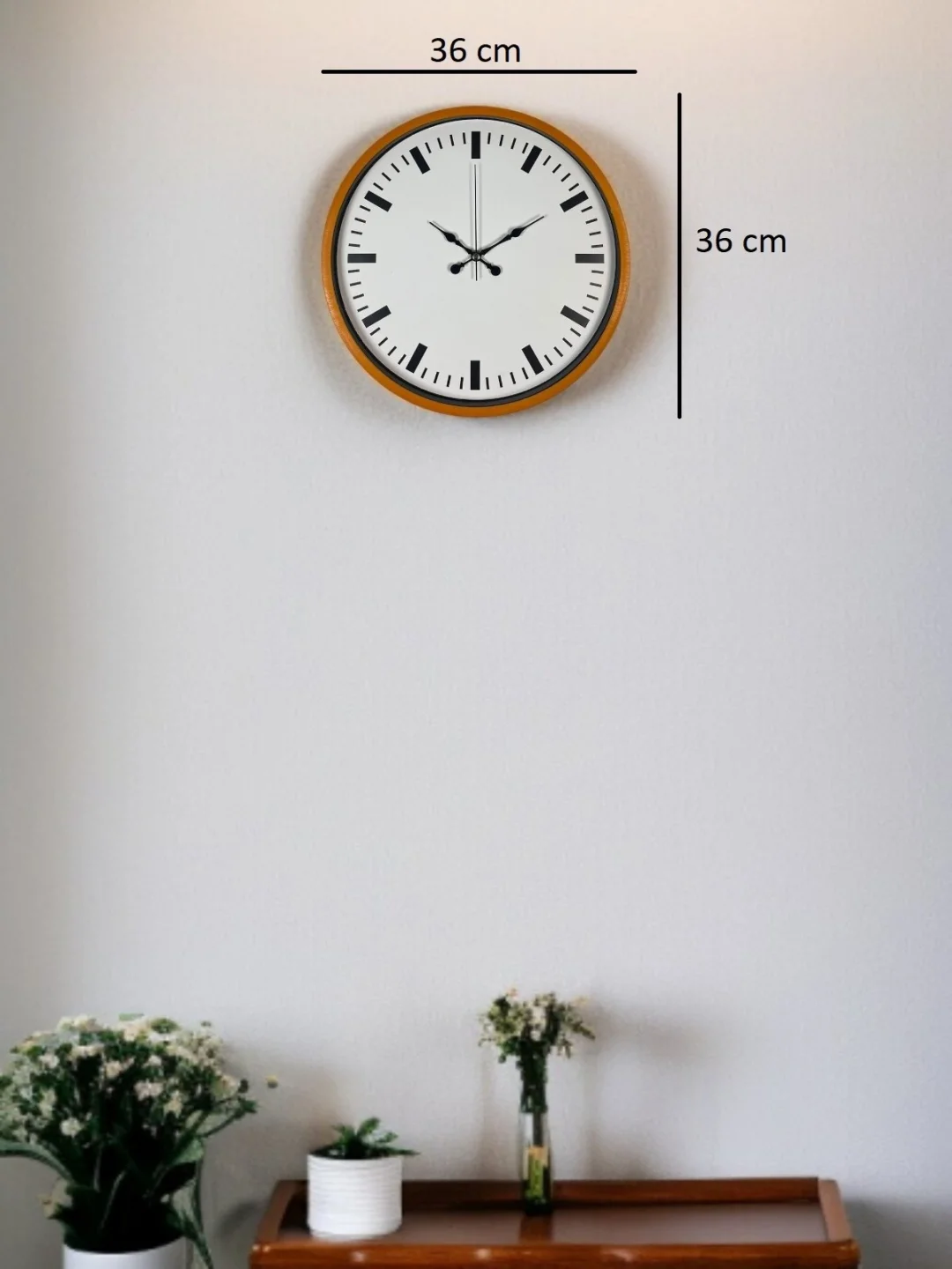 Canlı turuncu çerçevesiyle bulunduğu ortama dinamizm katan bu 36 cm duvar saati, rakamsız ve çizgi indeksli kadran tasarımıyla modern dekorasyonlara güçlü bir uyum sağlar. Beyaz zemin üzerindeki siyah indeksler, saatin okunurluğunu artırırken sade ve şık bir görünüm sunar.