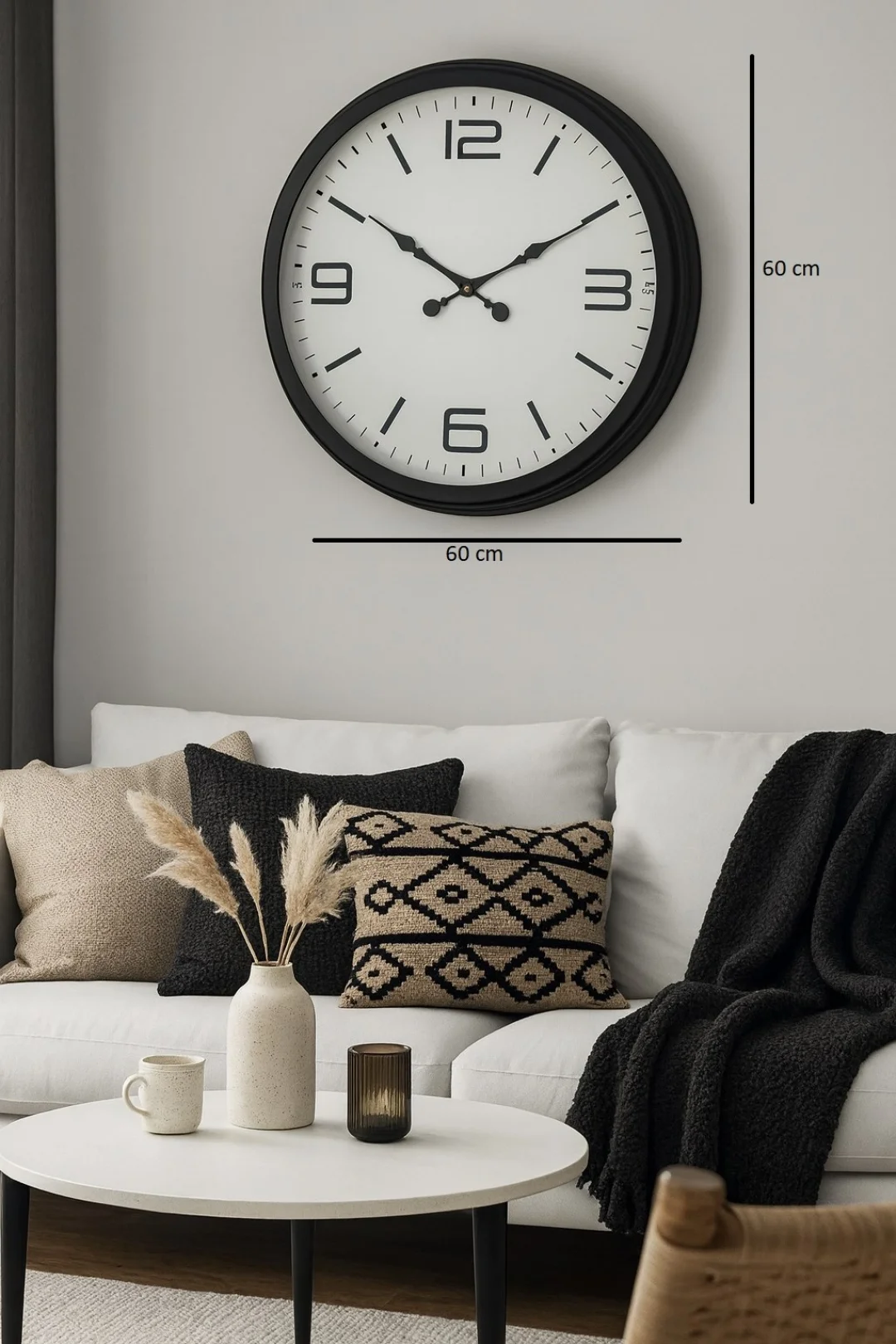 Şık ve modern tasarımıyla dikkat çeken 60 cm Siyah fırın Boyalı duvar saatimiz, sessiz akar saniye mekanizmasıyla konforlu bir kullanım sunar. Gerçek cam koruma paneli sayesinde uzun ömürlü ve dayanıklıdır. Estetik görünümüyle hem ev hem de iş yerleri için ideal bir dekoratif üründür.