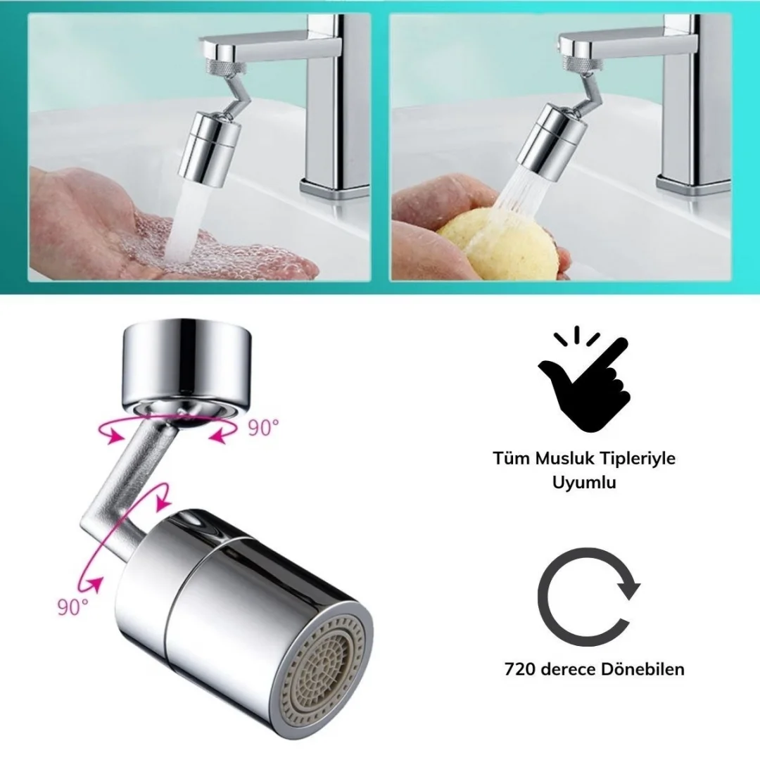 720 Derece Dönebilen Musluk Başlığı sayesinde artık kovalara su doldurmak, yüzünüzü ve ağzınızı, kollarınız ıslanmadan pratik bir şekilde yıkamak çok kolay Pratik bir şekilde monte etmenizi sağlayacak 720 Derece Dönebilen Tüm Musluk Tipleri İle Uyumlu Musluk Başlığı'nın içerisinden çıkan monte aparatları işinizi çok kolaylaştıracaktır Tüm musluk tipleri ile uyumludur