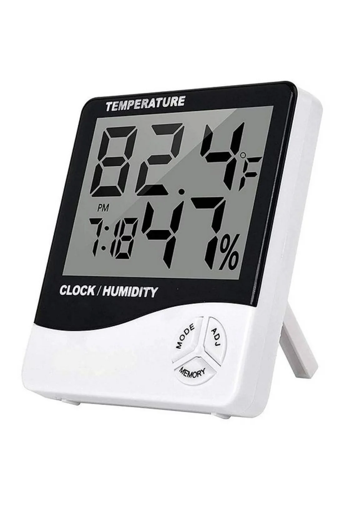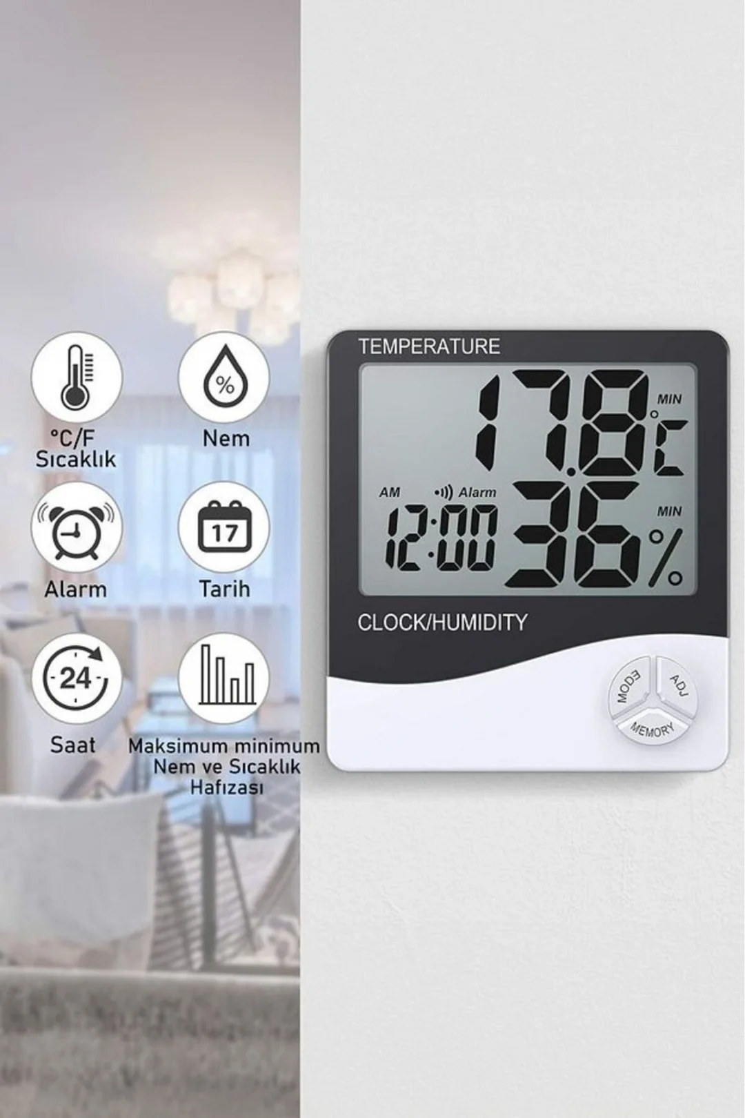 Mey İthalat® İç ve Dış Ortam Sıcaklığını Ölçebilen LCD Ekran Saat Göstergeli Alarmlı Nem Ölçer Termometre