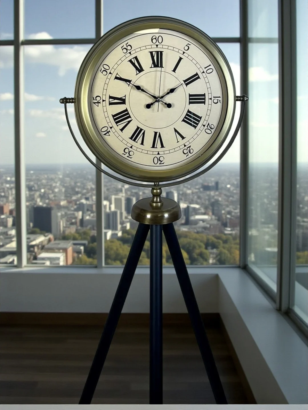 Saatin gövdesinde kullanılan eskitme metal kaplama, vintage ve endüstriyel dekorasyon tarzlarını kusursuz şekilde tamamlar. İnce işçilikle üretilmiş tripod ayakları sayesinde zeminde dengeli ve sağlam bir duruş sergiler. Salon, ofis, çalışma odası, otel lobisi, kafe ve restoran gibi geniş alanlarda güçlü bir görsel odak noktası oluşturur.