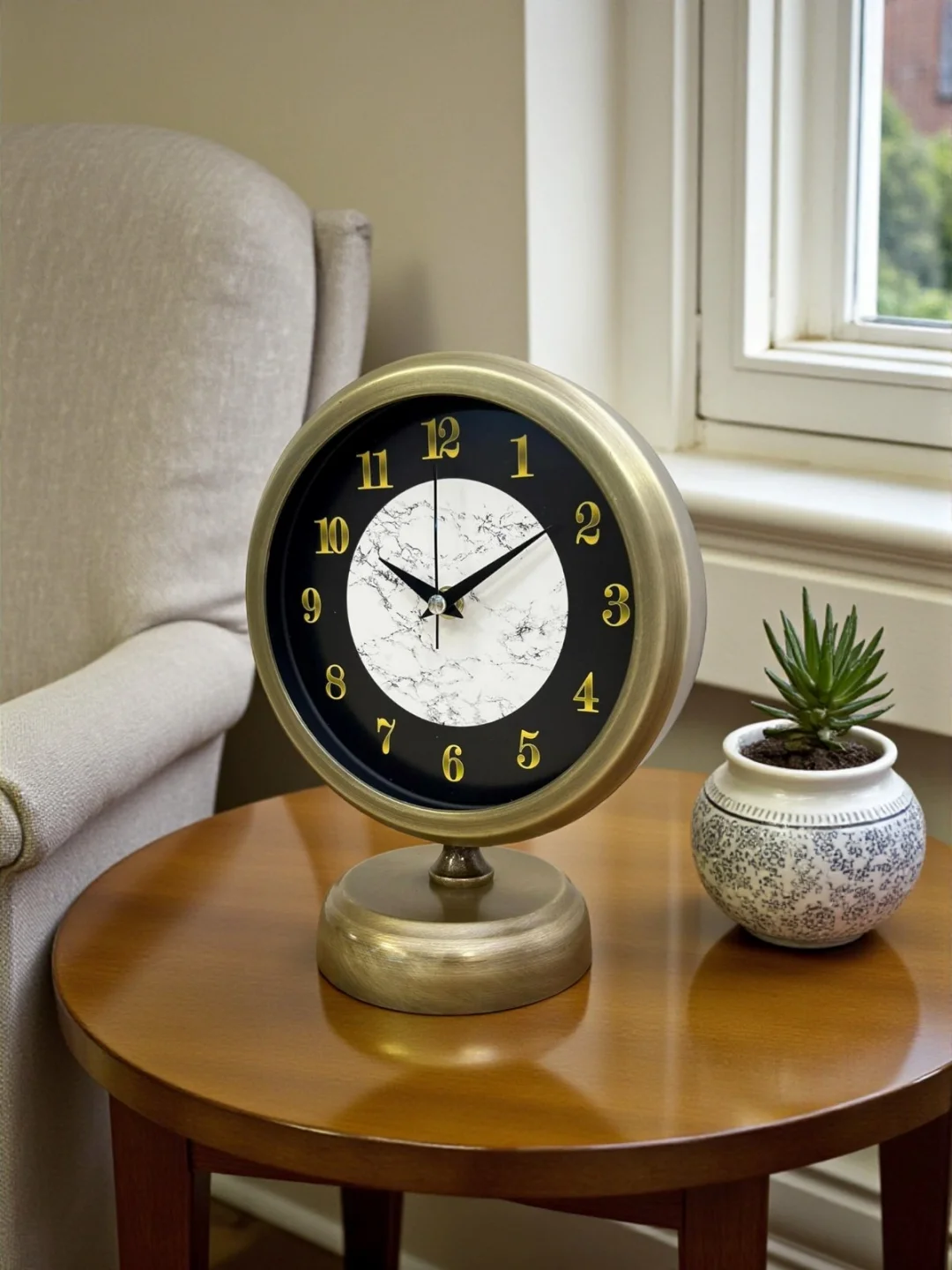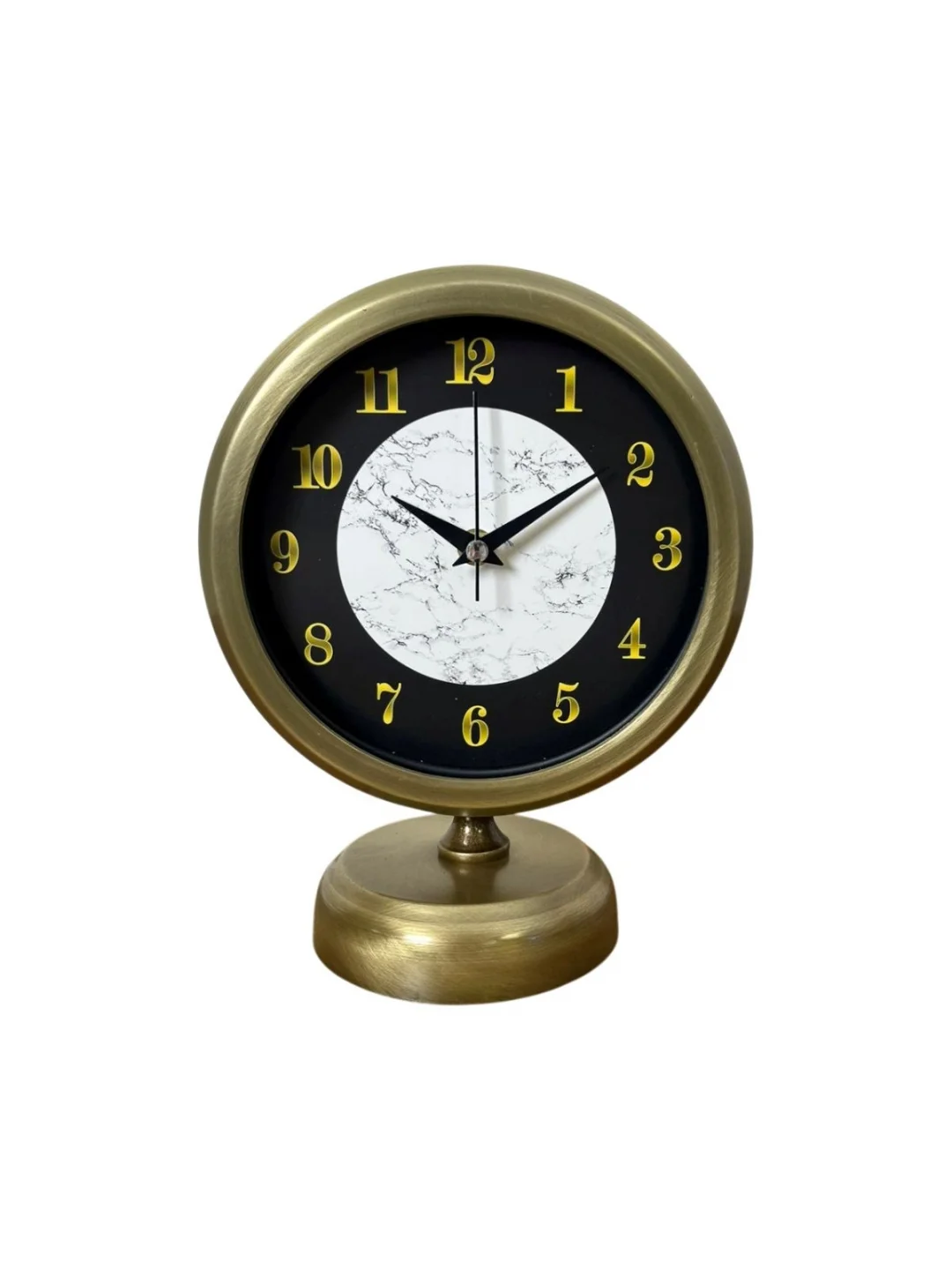 Klasik çizgileri modern detaylarla birleştiren bu eskitme gold masa saati, bulunduğu ortama sofistike bir hava katar. Siyah zemin üzerinde yer alan mermer desenli kadranı ve gold rakamlarıyla dikkat çeken tasarımı; salon, çalışma odası, ofis, konsol üstü ve vitrinler için kusursuz bir tamamlayıcıdır. 25 x 20 cm ölçüsü sayesinde hem yer kaplamaz hem de dekorasyonda güçlü bir duruş sergiler.