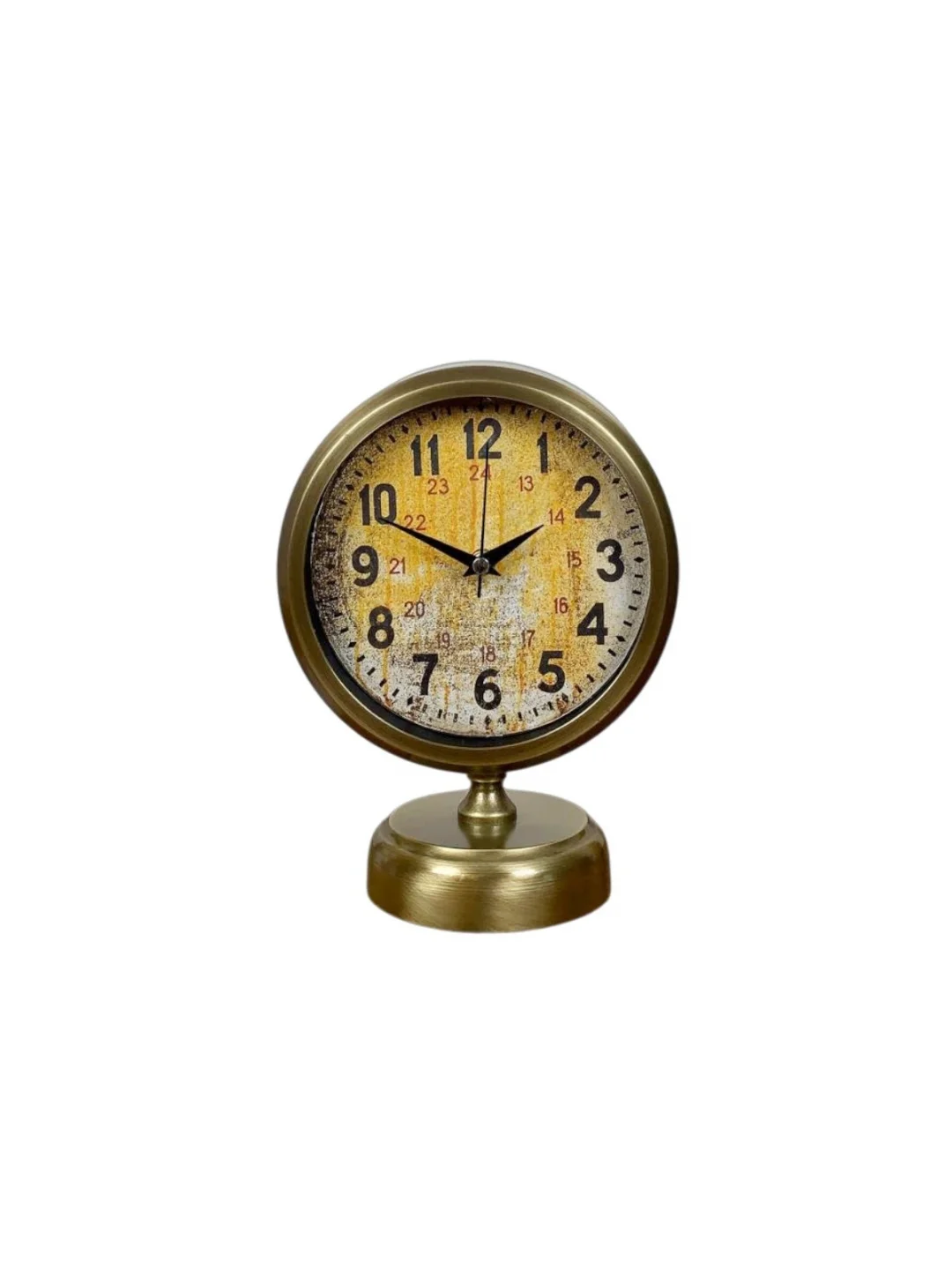 Kadran üzerinde yer alan 24 saat göstergesi, bu modeli standart masa saatlerinden ayıran en önemli özelliklerden biridir. Hem dekoratif hem de işlevsel olan bu detay, saate teknik ve koleksiyonluk bir hava kazandırır. Eskitme metal çerçevesi ve dengeli tabanı sayesinde sağlam bir duruş sergiler.