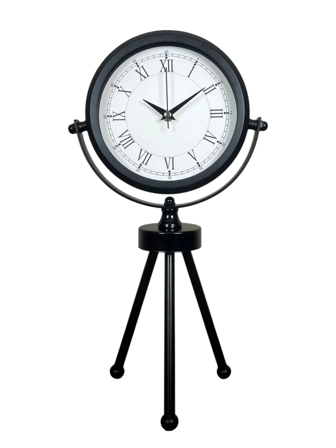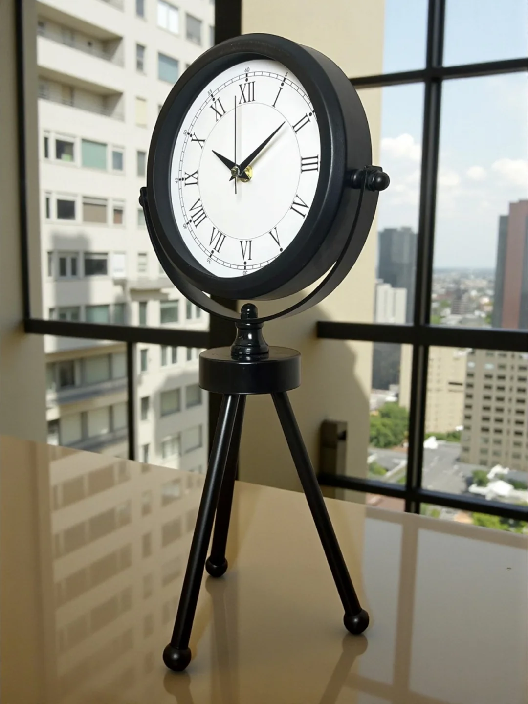 45 x 25 cm ölçülerindeki bu modern siyah üç ayaklı masa saati, minimal tasarımı ve güçlü duruşuyla her ortama şıklık katar. Gerçek cam korumalı kadranı sayesinde net görüntü ve uzun ömürlü kullanım sağlar. Tamamen metal gövdesi ve tripod ayak yapısıyla sağlam, dekoratif ve premium bir görünüm sunar. Sessiz akar saniye mekanizmasıyla ev, ofis ve çalışma alanlarında rahatsızlık vermeden kullanılabilir.